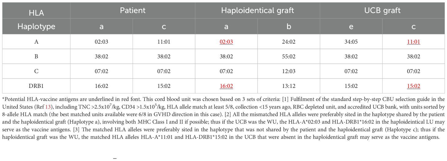 This study demonstrates the feasibility of HLA-vaccine transplantations for refractory leukemia, extending beyond double-unit cord blood to haploidentical–cord blood or haploidentical–haploidentical HSCT. If validated in other cohorts, this approach may broaden accessibility, as suitable vaccine-effect double-cord units are not always available as illustrated in our cohort. Recent randomized studies have demonstrated favorable survival after haploidentical–cord blood HSCT without excessive toxicities (7, 8).