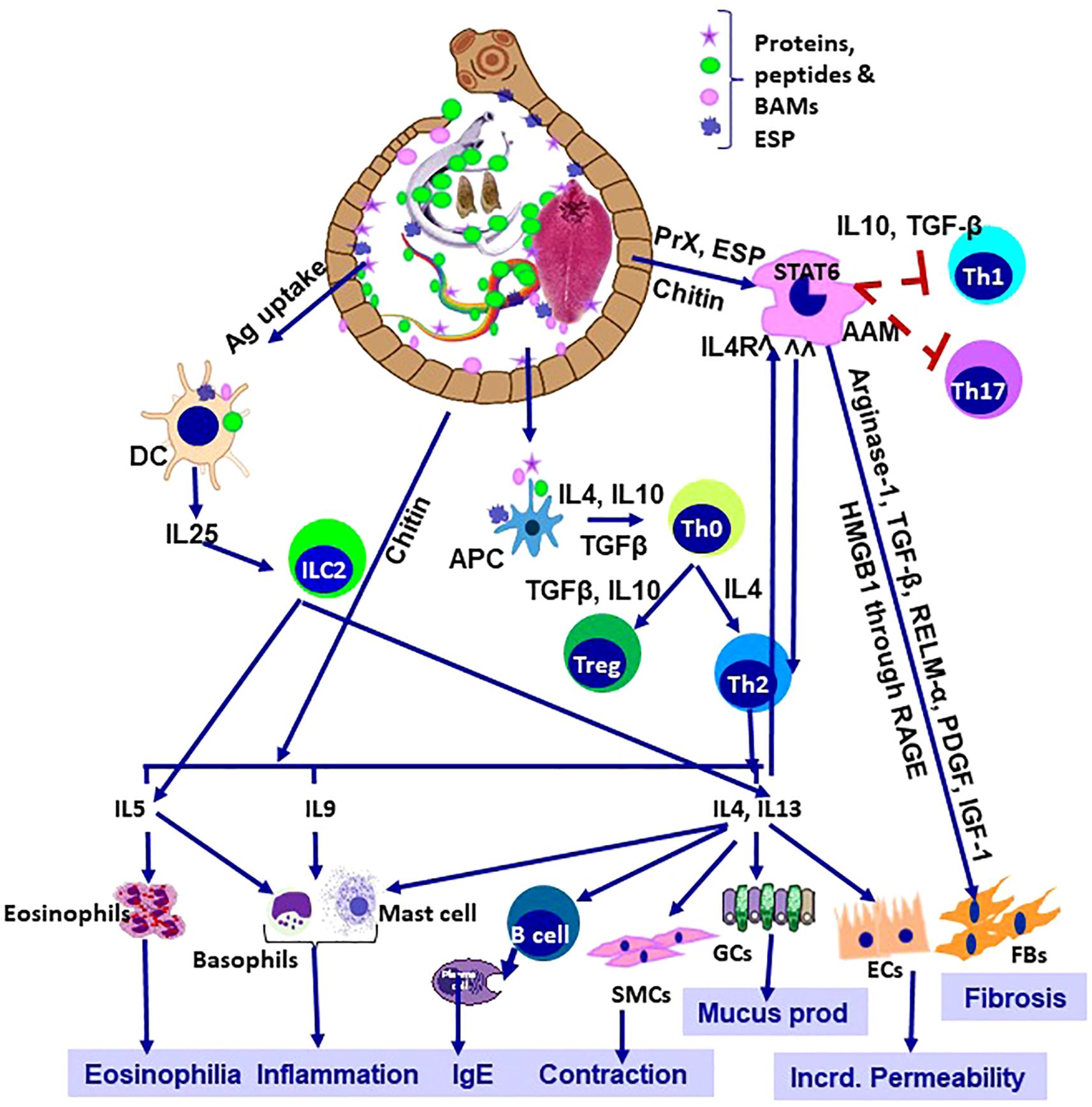 Figure 1. Helminthiosis: Immunological orchestra and patho-biology. AAM, alternatively activated macrophage; APC, antigen presenting cell; DC, dendritic cell; SMCs, smooth muscle cells, GCs, goblet cells; Ecs, epithelial cells; FBs, fibroblasts; Incrd, increased; Ag, antigens; BAMs, bioactive molecules, PrX, 2-Cys peroxiredoxin; RELM-α, Resistin-like Molecule- α; PDGF, platelet-derived growth factor; IGF-1, insulin-like growth factor 1; HMGB1, High-Mobility Group Box 1, RAGE, receptor for advanced gycation end-products; ESP, excretory-secretory products.