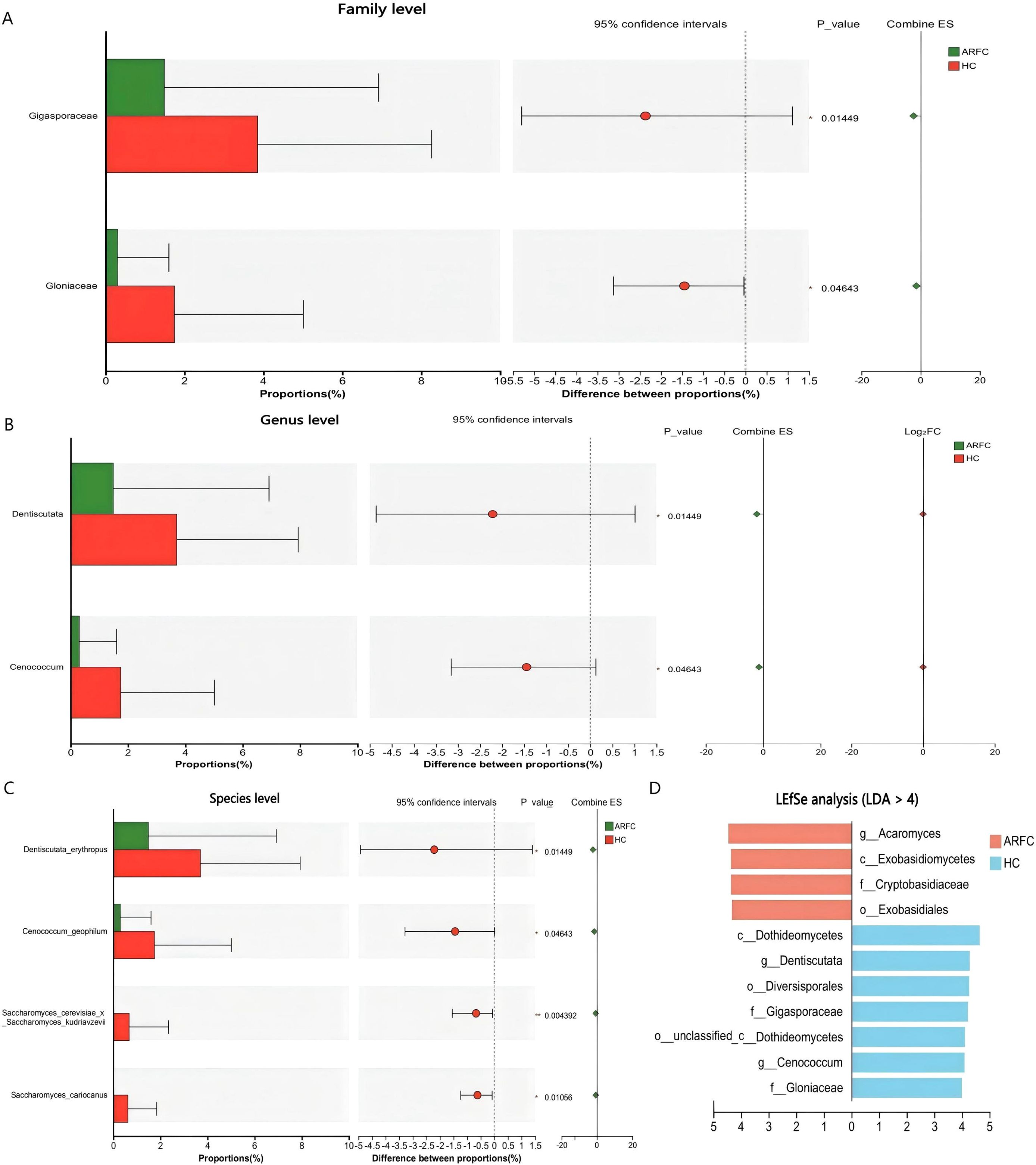 At the genus level, Dentiscutata (HC: 3.70 ± 4.24% vs. ARFC: 1.49 ± 5.43%; p = 0.015) and Cenococcum (HC: 1.74 ± 3.27% vs. ARFC: 0.30 ± 1.31%; p = 0.046) were depleted in ARFC (Supplementary Table S3; Figure 2B). Species-level depletion included Saccharomyces cerevisiae x S. kudriavzevii (HC: 0.67 ± 1.67% vs. ARFC: 0%; p = 0.004) and S. cariocanus(HC: 0.62 ± 1.22% vs. ARFC: 0%; p = 0.011) (Supplementary Table S4; Figure 2C).