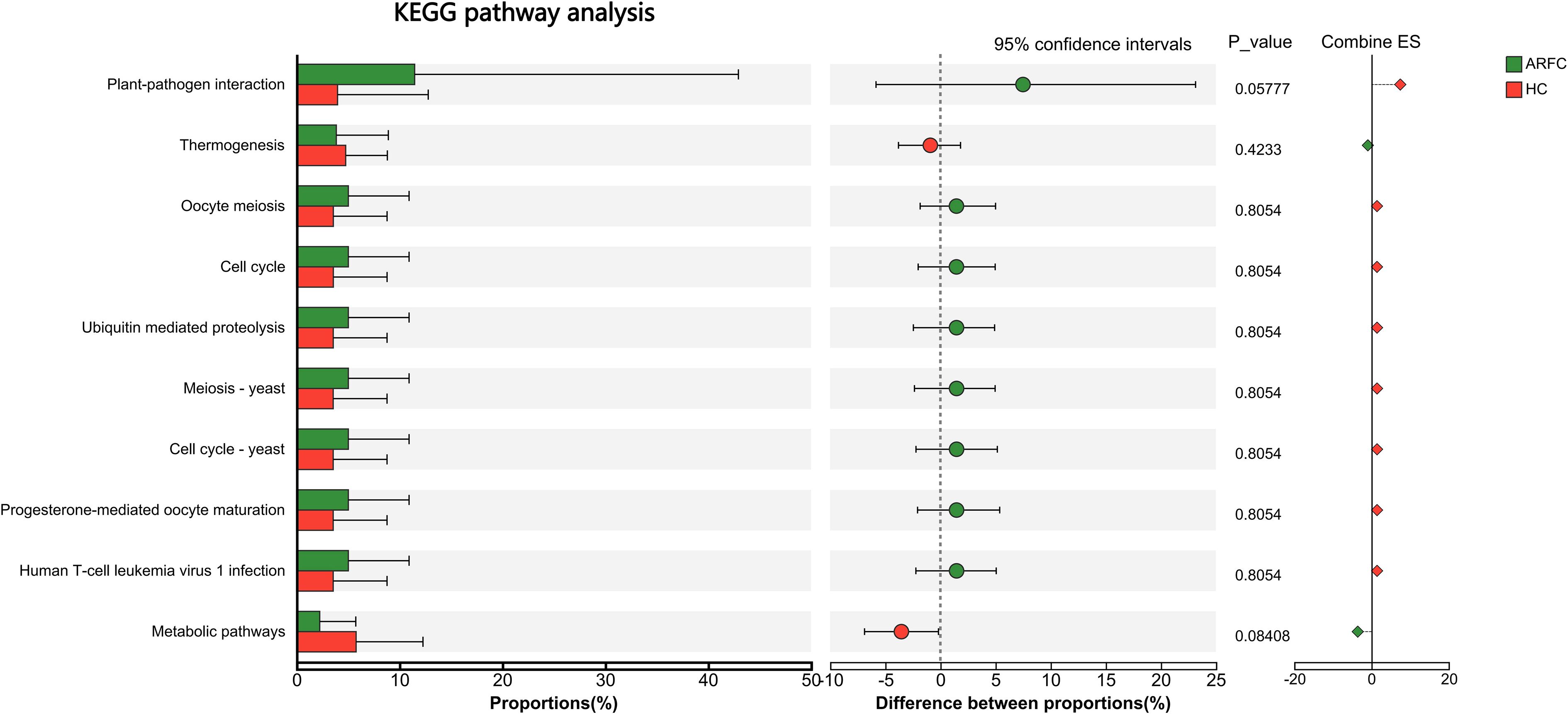Figure 5. Predicted functional potential of the gut mycobiota based on KEGG pathway analysis. No significant differences were observed between ARFC and HC groups at any KEGG pathway level (Levels 1–3), as assessed by the ReporterScore algorithm (absolute score < |1.5|, not significant). Bar plots represent the relative abundance of KEGG pathways in each group.