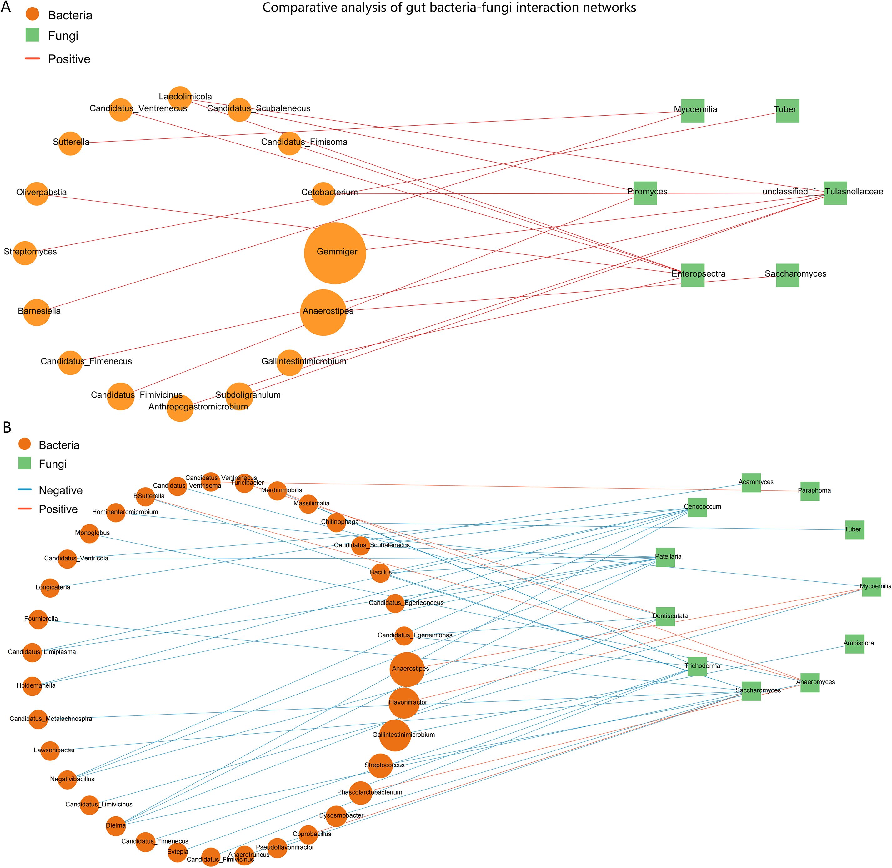 Figure 6. Comparative analysis of gut bacteria-fungi interaction networks in HC and ARFC children. Networks depict significant Spearman correlations (|r| ≥ 0.6, p < 0.05). Nodes: yellow circles (bacterial genera), green squares (fungal genera). Edges: red (positive correlations), blue (negative correlations). (A) HC network is characterized by numerous negative correlations, suggesting competitive interactions. (B) ARFC network is exclusively positive, indicating a shift toward cooperative interkingdom structure and potential “co-dysbiosis.”.