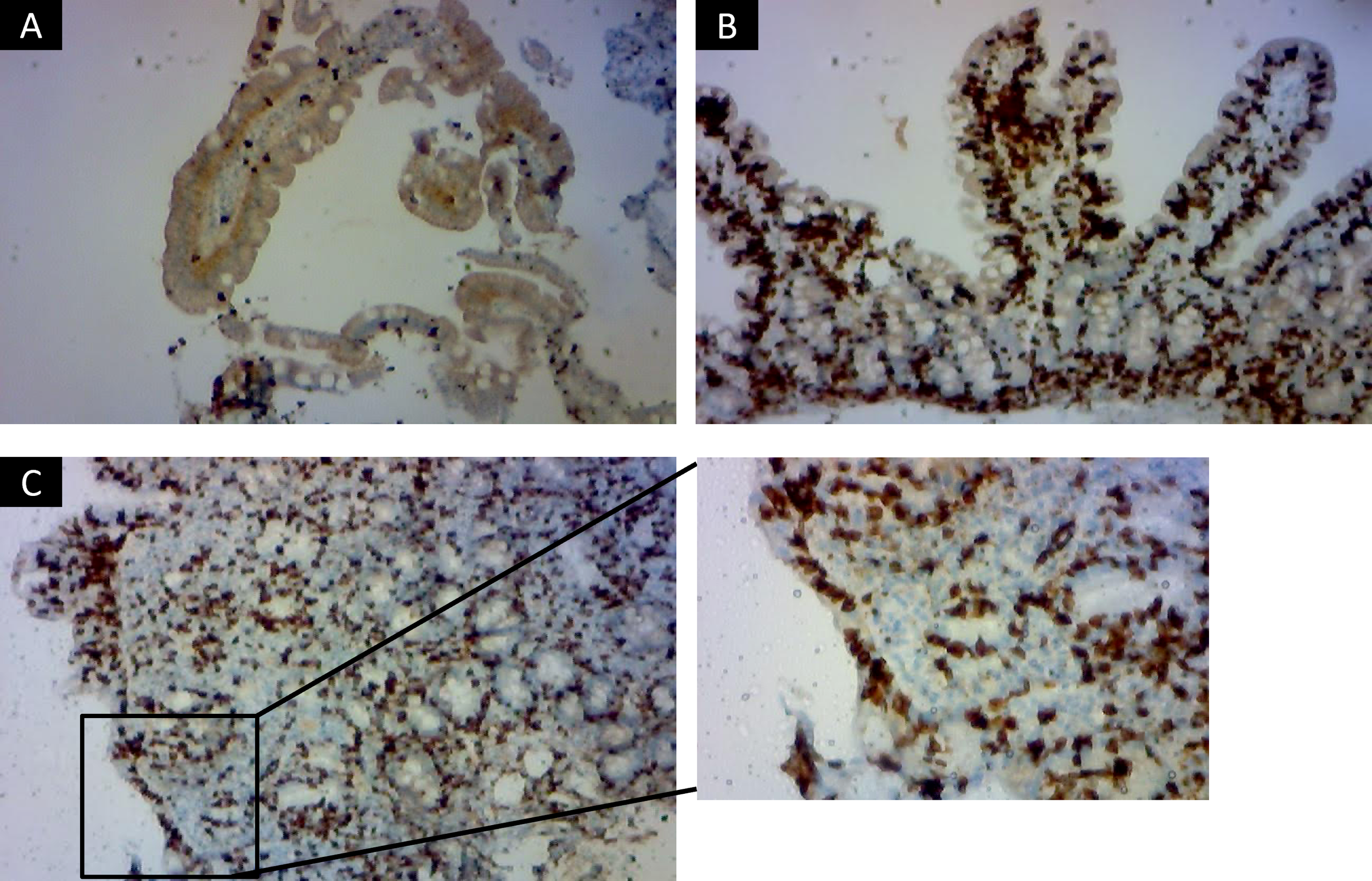 Immunohistochemical staining for CD8+ intraepithelial lymphocytes in duodenal biopsies across histological stages of celiac disease. Representative immunohistochemistry images showing CD8+ lymphocyte distribution in duodenal mucosa from three patients classified according to Marsh criteria. Marsh 0 Non-celiac subject (A), with preserved villous architecture and a physiological number of intraepithelial CD8+ lymphocytes scattered along the epithelial lining, consistent with a normal histological profile (x100). Marsh 1, representing a case of Suspected Seronegative Celiac Disease at Marsh 1 (B), in which the villous architecture is maintained but there is a marked increase in intraepithelial CD8+ lymphocytes, typical of genetically predisposed, seronegative individual (x400). Marsh 3 c (C) with confirmed celiac disease, showing total villous atrophy, crypt hyperplasia, and dense intraepithelial infiltration by CD8+ lymphocytes, characteristic of active disease (x100 and detail in x400). Images were acquired using an Olympus BX41 optical microscope.