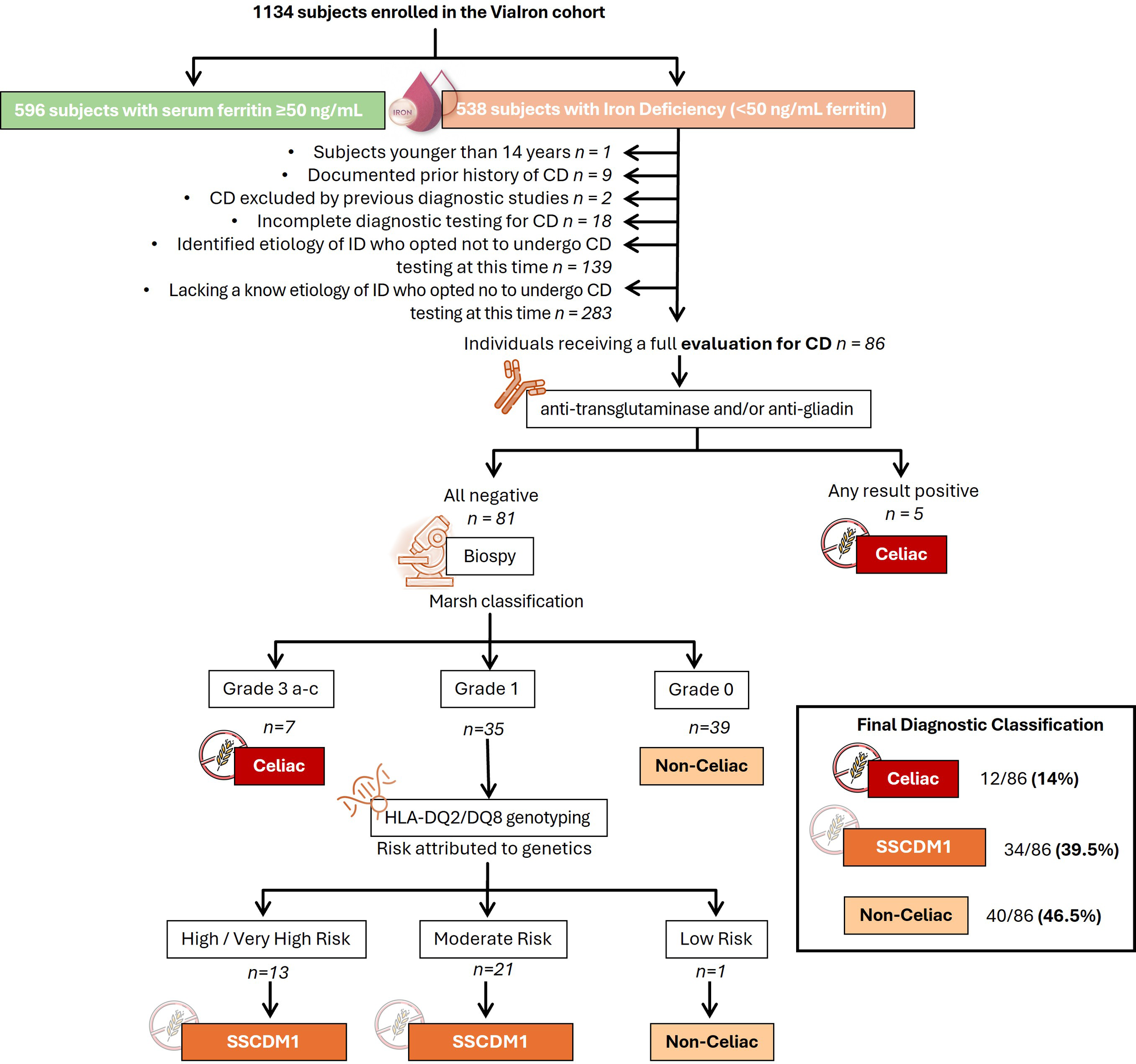 Immunohistochemical staining for CD8 was used to support the histological evaluation of duodenal biopsies, allowing for detailed assessment of IELs infiltration across the spectrum of mucosal lesions. Representative examples from patients are shown in Figure 1, highlighting the progressive increase in CD8+ IELs from normal mucosa to severe villous atrophy. The diagnostic algorithm was applied to all participants until they were classified into one of three diagnostic categories: celiac disease, SSCDM1, or Non-celiac. As shown in Figure 2, of the 1,134 individuals initially enrolled in the ViaIron cohort, 538 (47.4%) fulfilled criteria for absolute ID (ferritin levels <50 ng/mL). Among them, a substantial proportion did not undergo CD evaluation due to predefined exclusion criteria or patient decision, including age <14 years (n=1), previous diagnosis or exclusion of CD (n=11), incomplete diagnostic work-up (n=18), or the presence of an identified (n=139) or unidentified (n=283) alternative cause of ID with refusal of further CD testing based on patient preference. Consequently, 86 individuals (16% of those with absolute ID) underwent a complete diagnostic evaluation for CD. Five (5.8%) tested positive for antibodies and were directly diagnosed as Celiac. Among seronegative individuals, 7 (8.6%) presented with Marsh grade 3 a-c lesions and were also classified as Celiac. Forty participants (46.5%) were classified as Non-celiac, based on Marsh 0 histology (39 subjects, 45.3%) or Marsh 1 lesions along with non-permissive haplotypes (one subject, 1.2%) despite presenting symptoms and absolute ID. SSCDM1 was identified in 34 participants (39.5%), all of whom were seronegative, showed Marsh grade 1 lesions, and carried a high/very high (n = 13) or moderate (n = 21) genetic risk. In summary, within this highly selected subgroup, the final diagnostic classification included 12 patients (14%) as Celiac, 34 (39.5%) as SSCDM1, and 40 (46.5%) as Non-celiac. When considering only anemic participants, the distribution was as follows: 3 patients (15%) were classified as Celiac, 8 (40%) as SSCDM1, and 9 (45%) as Non-celiac.