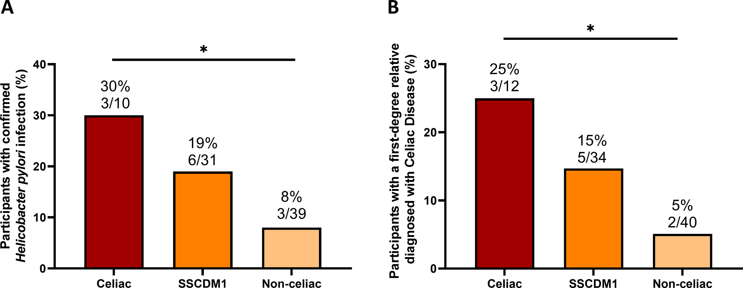 Frequency of Helicobacter pylori infection and family history of confirmed celiac disease diagnosis across celiac disease status. Frequency of Helicobacter pylori infection among participants for whom testing data were available (A) and frequency of positive family history of celiac disease in first-degree relatives, defined as parents or siblings (B). Analyses were restricted to participants with available data for each variable; therefore, the number of subjects per group differs from the total cohort. SSCDM1, Suspected Seronegative Celiac Disease at Marsh 1. Group comparisons were performed using the Chi-square test. Only comparisons with p-value < 0.1 are indicated. *0.01≤p-value<0.05.