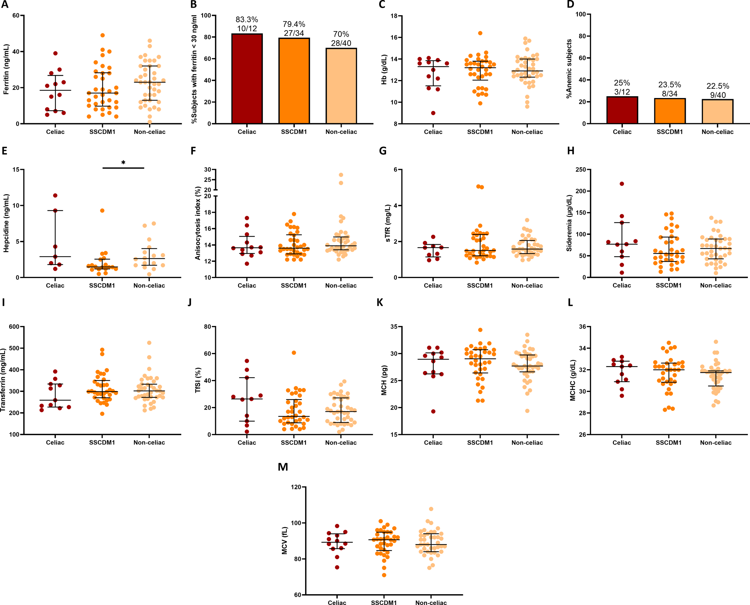 Clinical symptoms at presentation are summarized in Supplementary Table 1. Overall, a substantial proportion of patients were asymptomatic, particularly in the non-celiac group (52.5%). Across all categories, the most frequently reported manifestations were symptoms associated with absolute ID, including fatigue/adinamia, hair loss, brittle nails, and angular cheilitis. At least one ID–related symptom was present in 41.7% of patients classified as Celiacs, 52.9% of patients with SSCDM1, and 25% of non-celiac patients. Fatigue/adinamia was the most common symptom, reported by 33.3%, 44.1%, and 22.5% of patients in the Celiac, SSCDM1, and non-celiac groups, respectively.