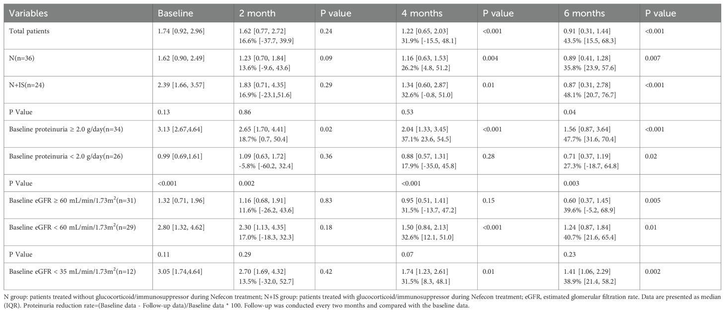 At month 2, the proteinuria decreased from 1.74 [0.92, 2.96] to 1.62 [0.77, 2.72] g/day, with a reduction rate of 16.6% [-37.7, 39.9] (p=0.24). At month 4, the proteinuria dropped to 1.22 [0.65, 2.03] g/day, representing a reduction rate of 31.9% [-15.5, 48.1] (p<0.001). At month 6, the proteinuria decreased to 0.91 [0.31, 1.44] g/day (p<0.001), with a reduction rate of 43.5% [15.5, 68.3]. A statistically significant reduction in proteinuria was observed after 4 months of treatment.