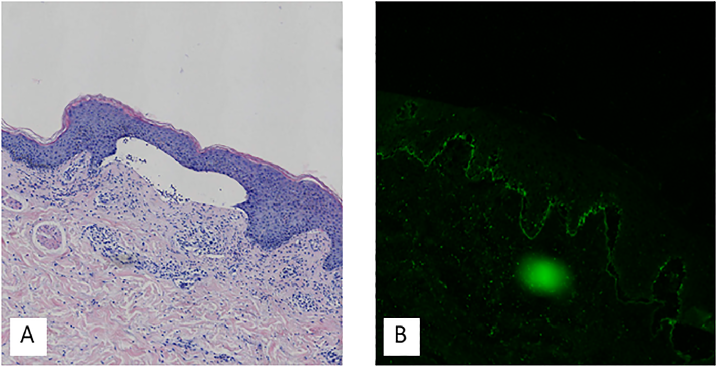 Hematoxylin-eosin staining showed hyperkeratosis, parakeratosis, acanthosis, subepidermal blister formation, and mild perivascular lymphocytic infiltration in the superficial dermis (A). Direct immunofluorescence demonstrated C3 deposits on the basement membrane (B).