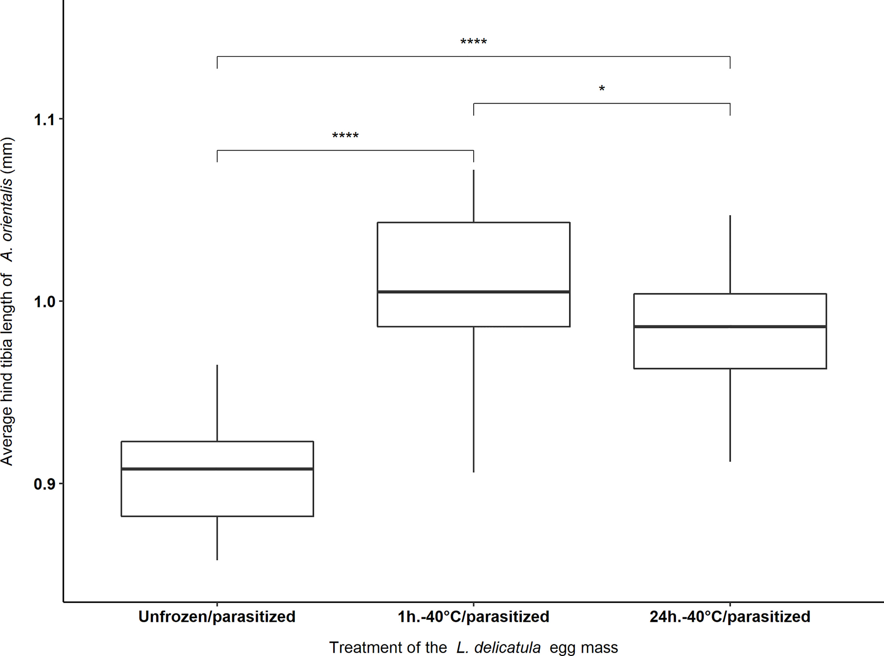 To evaluate the effect of -40°C exposures for 1 hour or 24 hours treatments on L. delicatula egg quality for A. orientalis development, the fitness of female parasitoids that successfully emerged from eggs cold stored at 5°C for four months, and four month old eggs that were exposed to -40°C for 1 hour or 24 hours only were assessed by using measurements of right hind tibia lengths as a proxy for parasitoid size and subsequent fitness (i.e., parasitoids with larger hind tibia are assumed to be bigger and more fit than parasitoids with smaller tibia). The four month storage period was selected for this study since it is the average approximate length of the storage period that the L. delicatula egg masses would be held for prior to use in experiments. Excised right hind tibiae were placed onto glass slides and covered with a second glass slide. Hind tibia length was measured from its attachment to the femur to the attachment point with the tarsi using a Leica S8AP0 microscope. Slide mounted hind tibiae were photographed at a magnification of 25 × with an attached Leica DMC2900 camera and length was measured using the Leica Application Suite version 4.6.2. A total of 25 A. orientalis females from each treatment, both freezing treatments (i.e., 1 hour and 24 hours at -40°C) and the control treatment [i.e., Unfrozen/parasitized treatment (Table 2)] were measured for a cumulative total of 75 female tibiae.