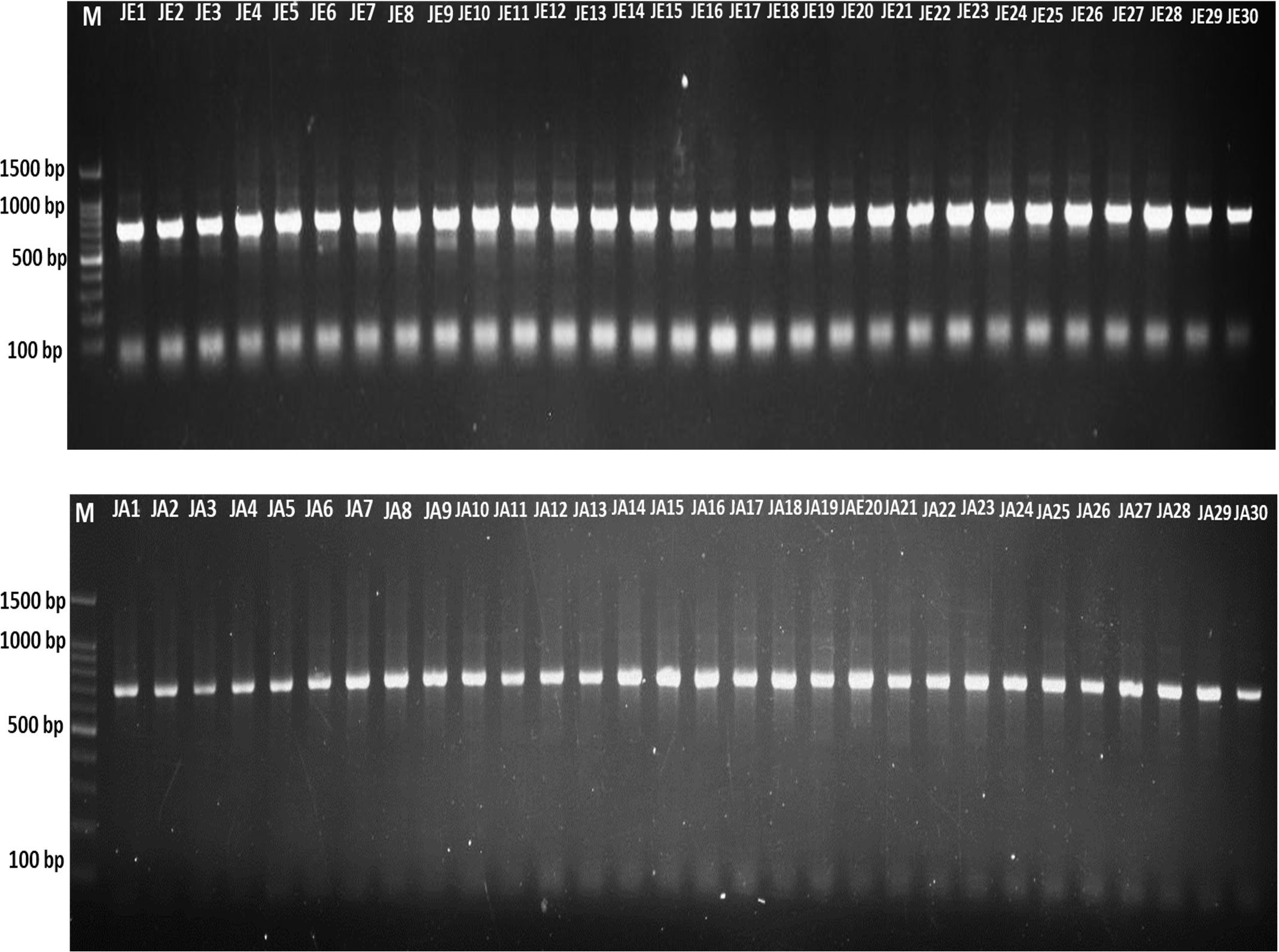 Figure 2. PCR amplification of the mT-COI gene was achieved in 48 mosquito samples. JE, Jeddah; JA, Jazan.