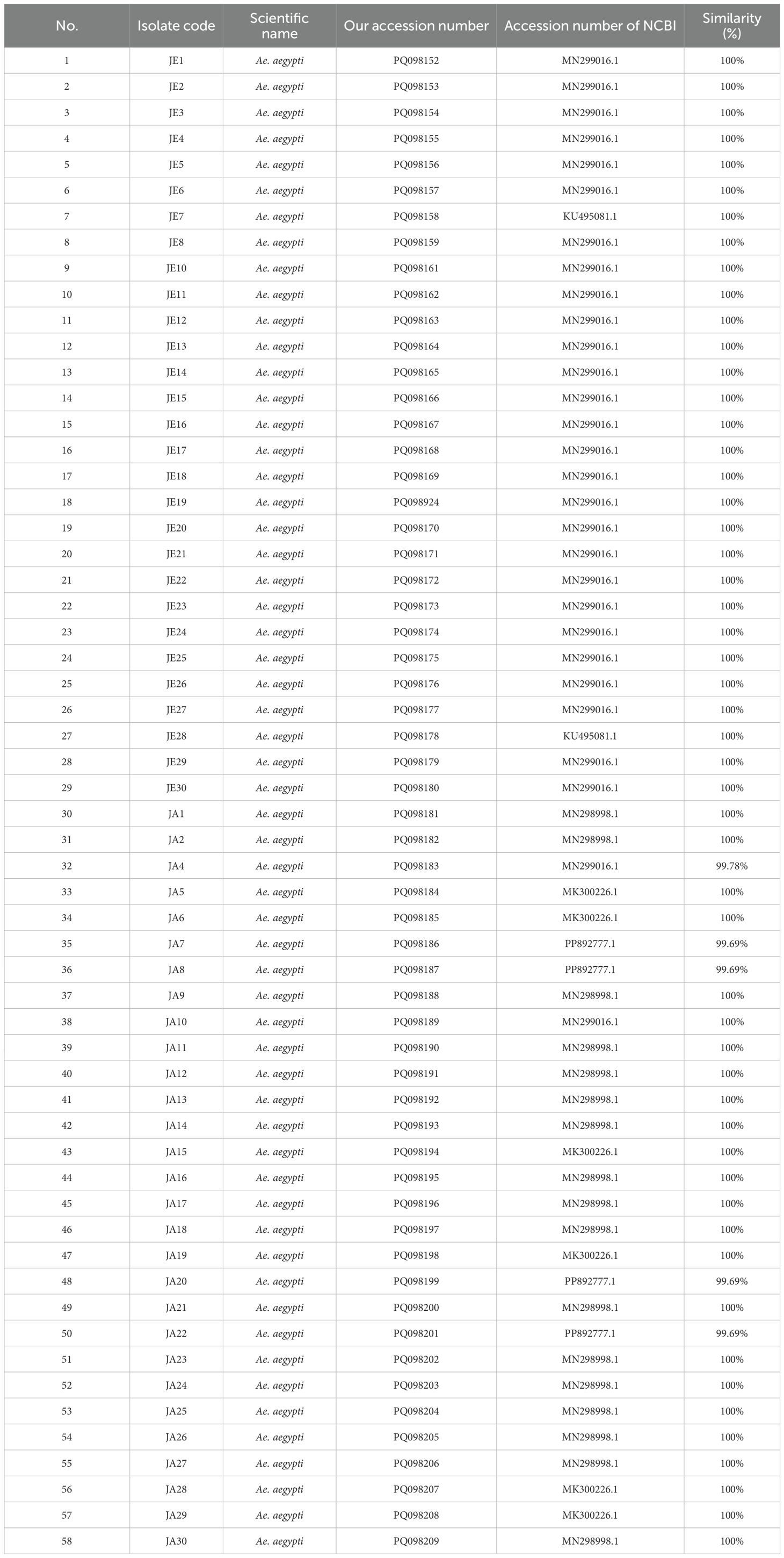 The DNA extraction and PCR amplification conducted yielded fragments of 600–700 bp, corresponding to the COX1 gene, which was sequenced successfully. The sequences obtained were compared with those available in the NCBI Gene Bank, confirming the samples’ species as Ae. aegypti (Tables 1, 2). These findings corroborated previous reports regarding the utility of the COX1 gene as a molecular marker for species-level identification in mosquitoes (30).