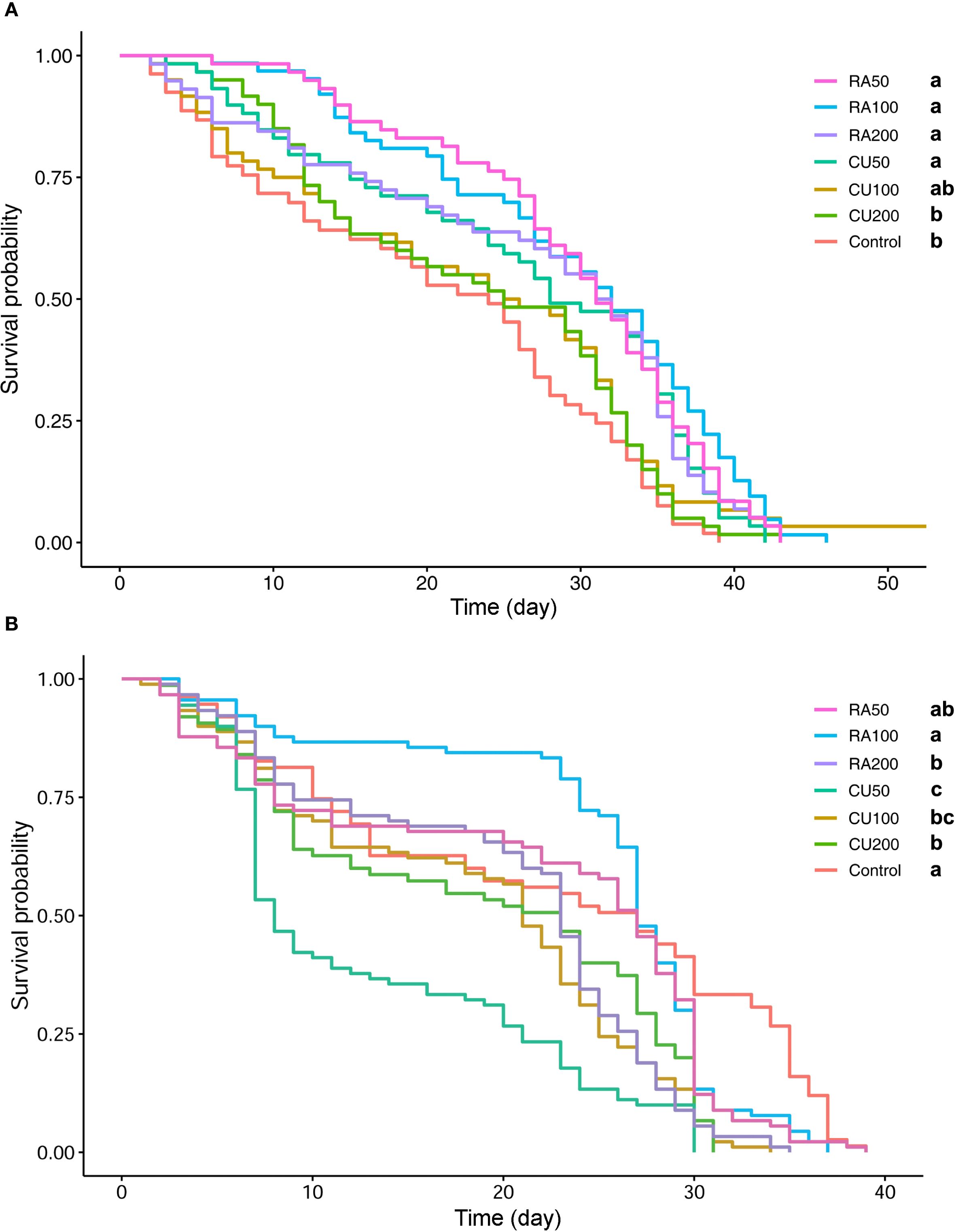 Figure 1. Kaplan–Meier survival curves of honey bees fed with different concentrations of curcumin (CU) and rosmarinic acid (RA) for 48 hours (A) and throughout their lifespan (B). Treatments included RA at 50, 100, and 200 ppm (RA50, RA100, RA200) and CU at 50, 100, and 200 ppm (CU50, CU100, CU200), compared with an untreated control group. Different letters indicate statistically significant differences among treatments (log-rank test, P < 0.05).