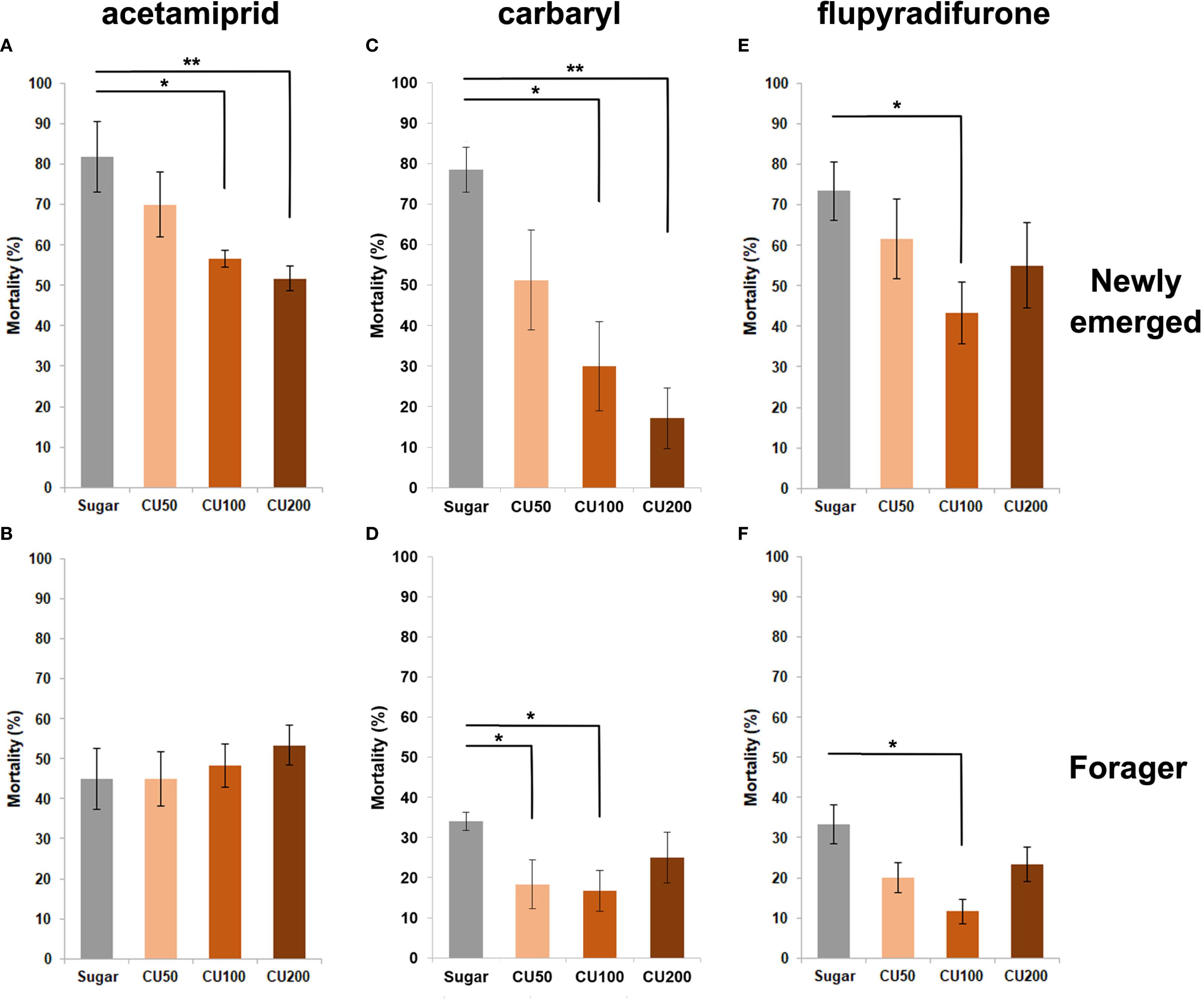 Figure 2. Effect of different concentrations (50, 100, and 200 ppm) of curcumin (CU) on the mortality of newly emerged bees (A, C, E) and foragers (B, D, F) exposed to acetamiprid (A, B), carbaryl (C, D), and flupyradifurone (E, F). Bees were orally fed CU-supplemented food for 48 h following topical exposure to the pesticides. Mortality was assessed after 48 h. Bars represent mean ± SE. Statistical comparisons were performed using one-way ANOVA followed by Tukey’s HSD post-hoc test. Asterisks indicate significant differences compared to the sugar-fed control group: * p < 0.05, ** p < 0.01.