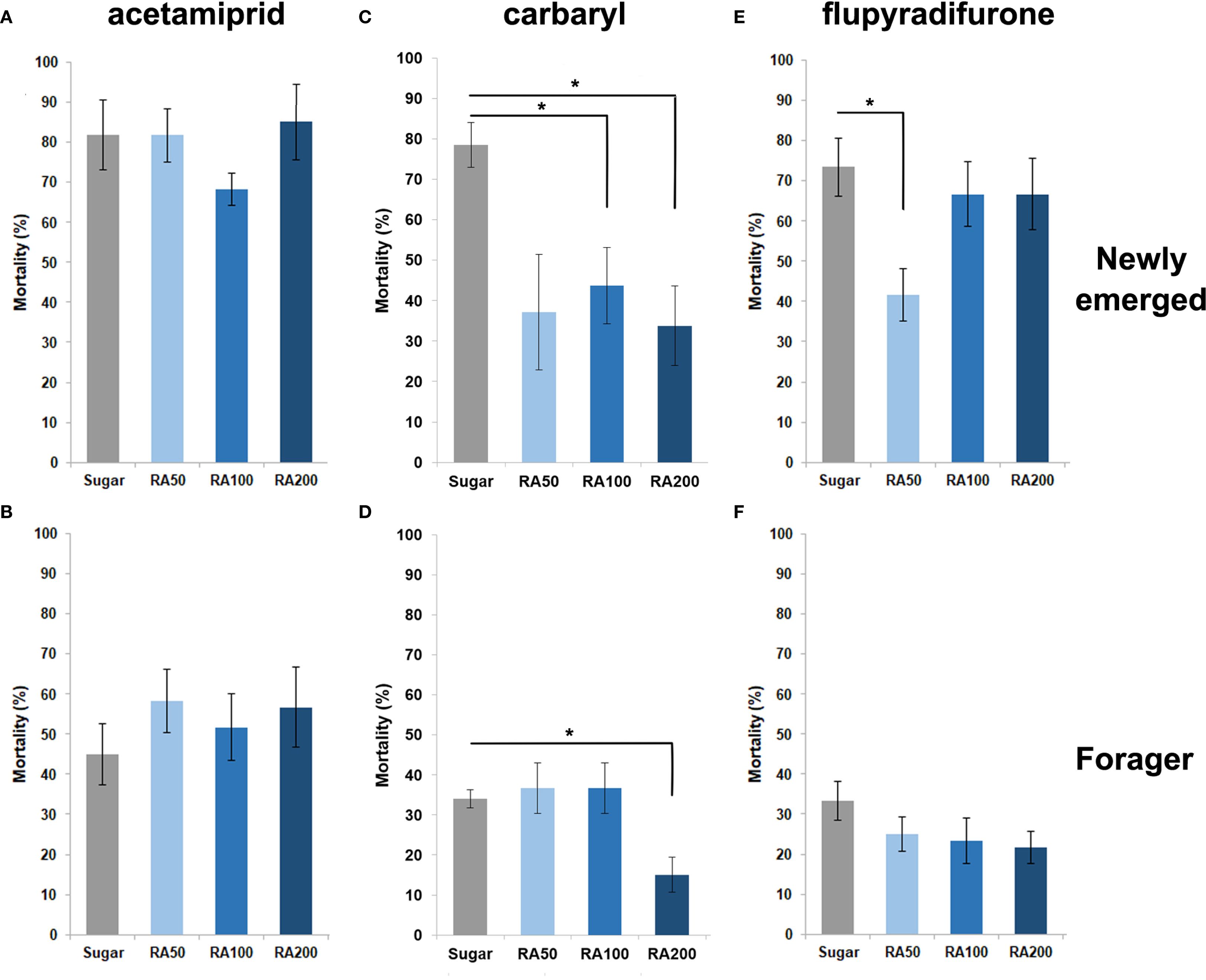 Figure 3. Effect of different concentrations (50, 100, and 200 ppm) of rosmarinic acid (RA) on the mortality of newly emerged bees (A, C, E) and foragers (B, D, F) exposed to acetamiprid (A, B), carbaryl (C, D), and flupyradifurone (E, F). Bees were orally fed CU-supplemented food for 48 h following topical exposure to the pesticides. Mortality was assessed after 48 h. Bars represent mean ± SE. Statistical comparisons were performed using one-way ANOVA followed by Tukey’s HSD post-hoc test. Asterisks indicate significant differences compared to the sugar-fed control group: *p < 0.05.