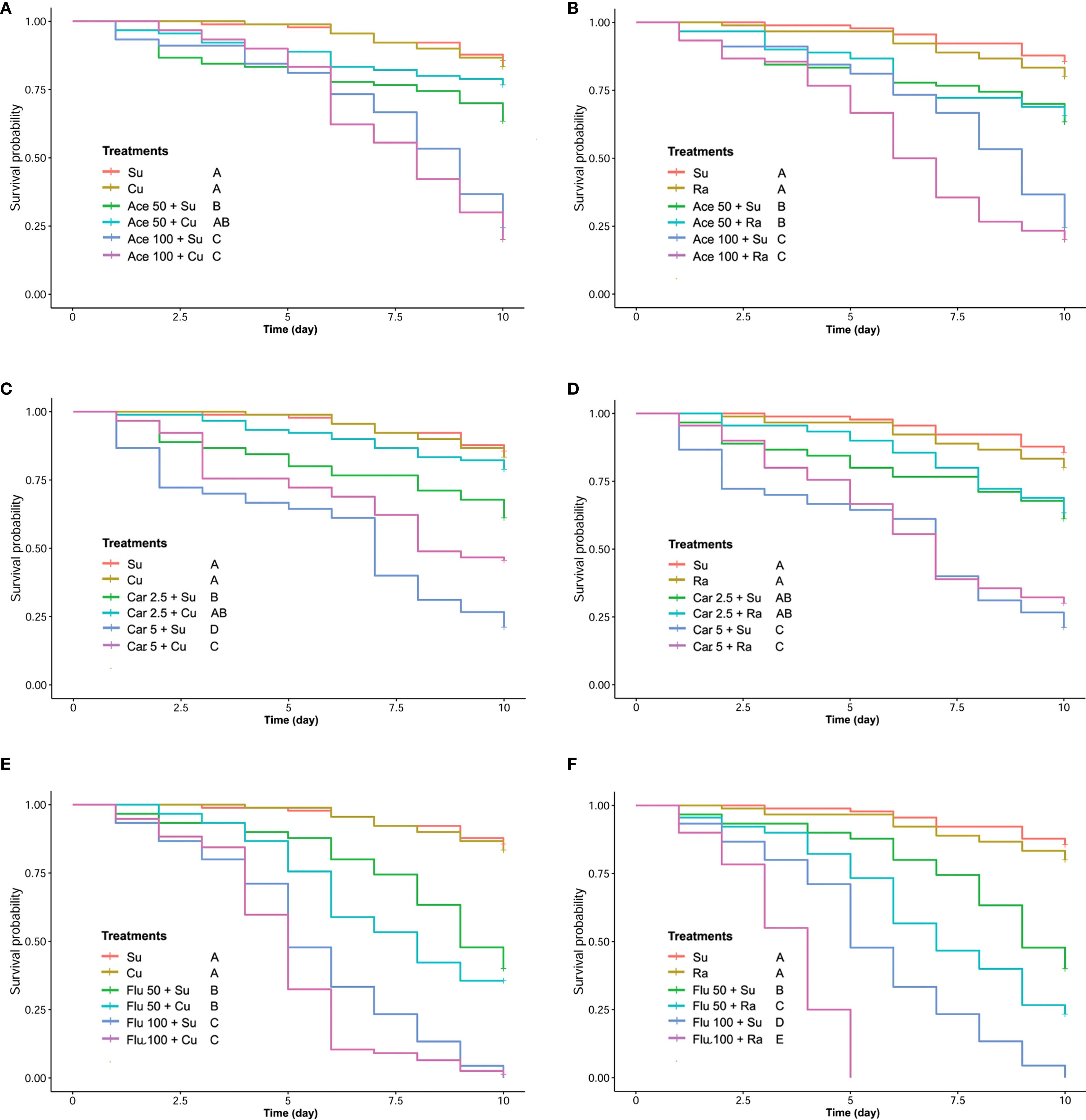 Figure 4. The Kaplan-Meier survival analysis of honey bees chronically exposed to different concentrations of acetamiprid (A, B), carbaryl (C, D) and flupyradifurone (E, F) while providing CU100 (A, C, E) or RA100 (B, D, F).