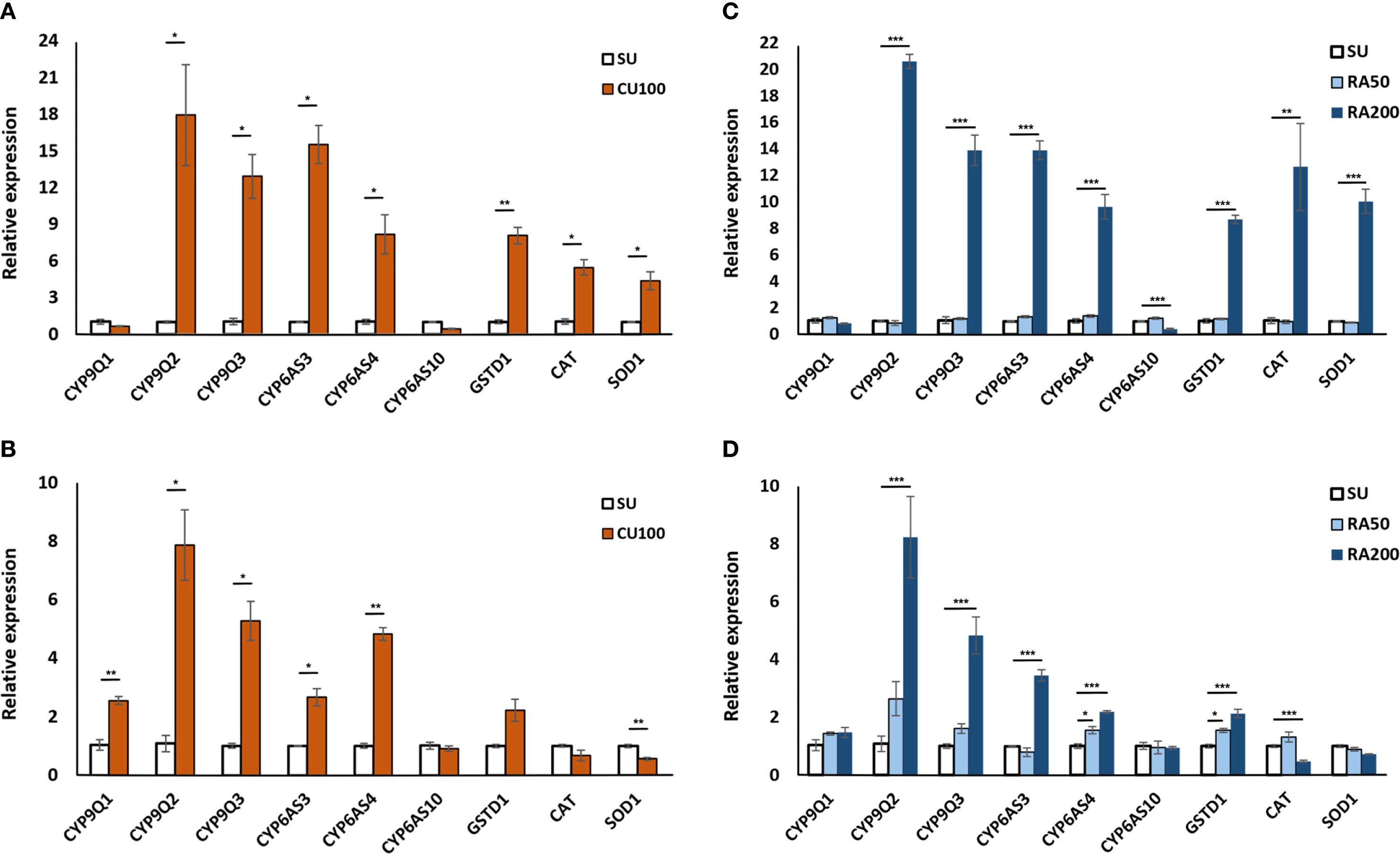 Figure 5. Gene expression profiles in the head (A, C) and abdomen (B, D) of honey bees at 24 hours’ post-treatment. (A, B) show bees fed with CU100, while (C, D) show bees fed with two concentrations of rosmarinic acid (RA50 and RA200). SU represents the control group fed only sugar syrup. Relative expression levels of detoxification- and antioxidant-related genes were measured. Asterisks indicate statistically significant differences compared to the control group (*p < 0.05, ** p < 0.01, ***p < 0.001).