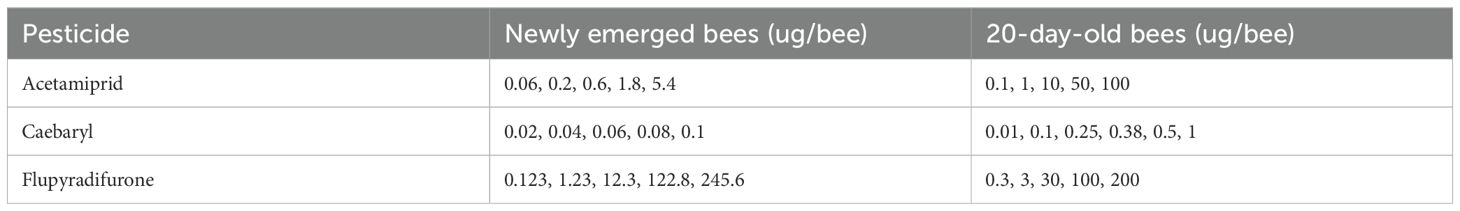 Table 1. Pesticides and the range of applied doses (µg/bee) used to evaluate dose-dependent mortality in newly emerged and 20-day-old honey bees (Apis mellifera).