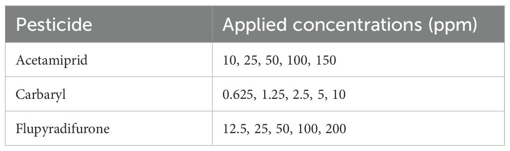 The technical analytical grade (purity > 99%) of flupyradifurone, acetamiprid and carbaryl, were obtained from Sigma-Aldrich (South Korea). All technical analytical grade insecticides were dissolved in acetone to obtain the stock solution and further diluted in different proportions to obtain the specific doses.