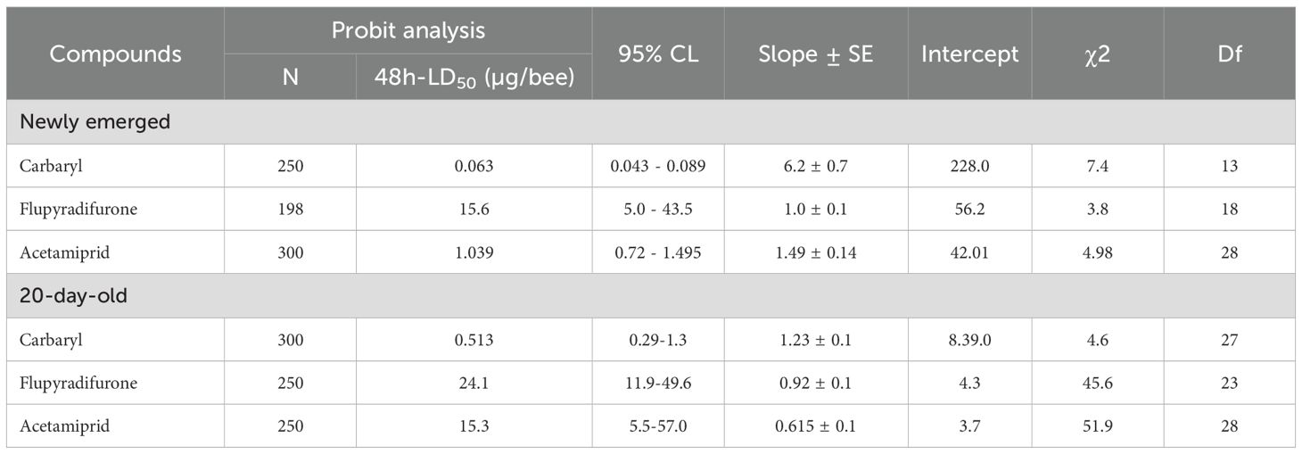 Table 3. Estimated 48-hour contact LD50 values (µg/bee) and associated 95% confidence limits (CL), slope ± standard error (SE), intercept, chi-square (χ²), and degrees of freedom (df) obtained from probit analysis for newly emerged and 20-day-old honey bees (Apis mellifera) exposed to three insecticides.