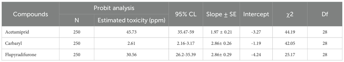 Table 4. Estimated 10-day oral LC50 values (ppm) and associated 95% confidence limits (CL), slope ± standard error (SE), intercept, chi-square (χ²), and degrees of freedom (df) obtained from probit analysis for honey bees (Apis mellifera) exposed to three insecticides.