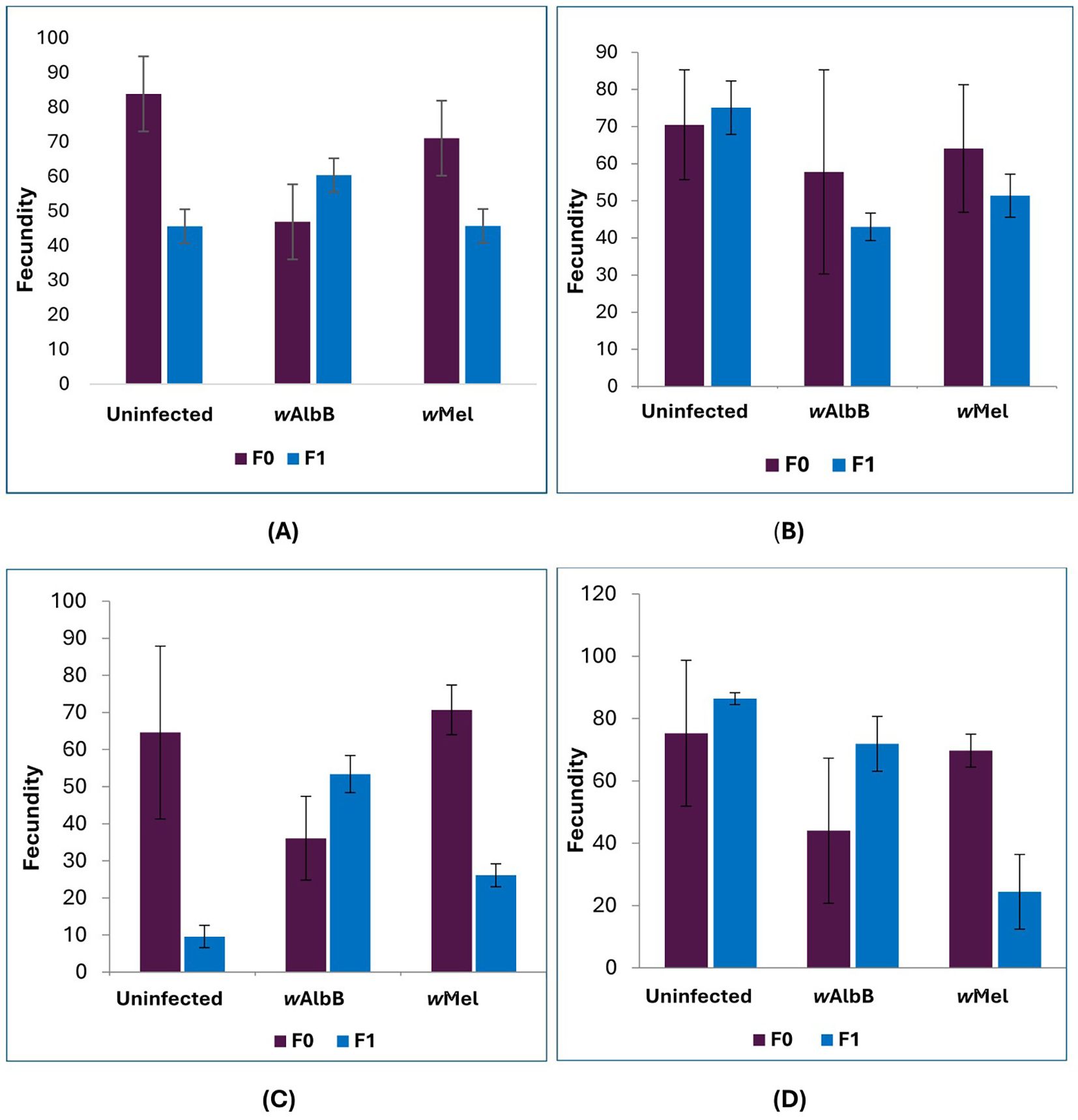 Four bar graphs labeled A to D compare fecundity across conditions: Uninfected, wAlb B, and wMel. Each graph features F0 and F1 groups. Graph A shows uninfected with highest fecundity for F0, wAlb B and wMel lower. Graph B displays balanced fecundity between F0 and F1. Graph C highlights lower wAlb B for F0 and higher wMel for F1. Graph D depicts increased fecundity for F1 across conditions, notably in wAlb B. Error bars indicate variability.