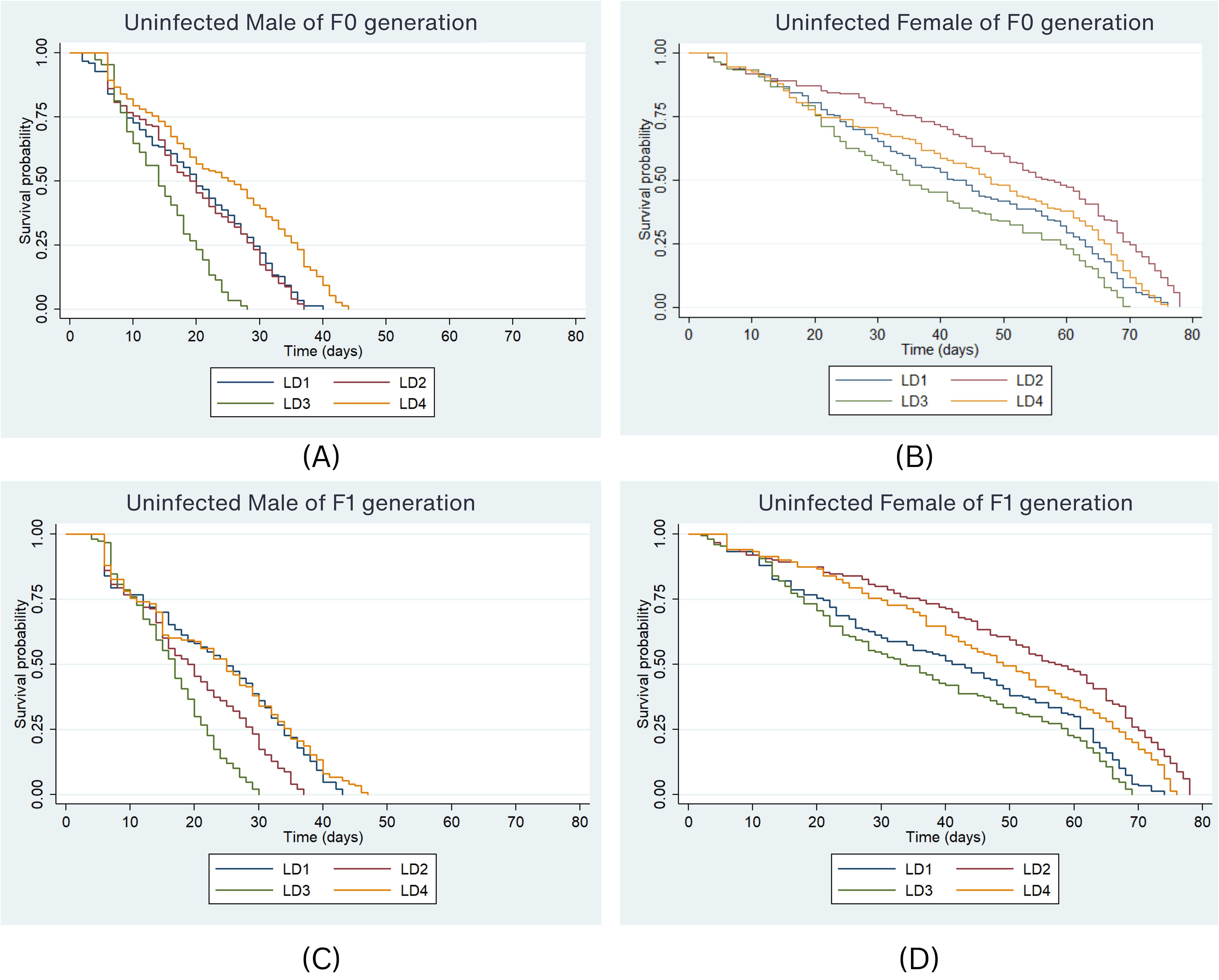 Survival probability graphs for uninfected male and female mice of F0 (A and B) and F1 (C and D) generations. Each graph shows survival probability over time in days, with different lines representing LD1, LD2, LD3, and LD4. The probability decreases over time, with females generally showing higher survival rates compared to males at equivalent times.