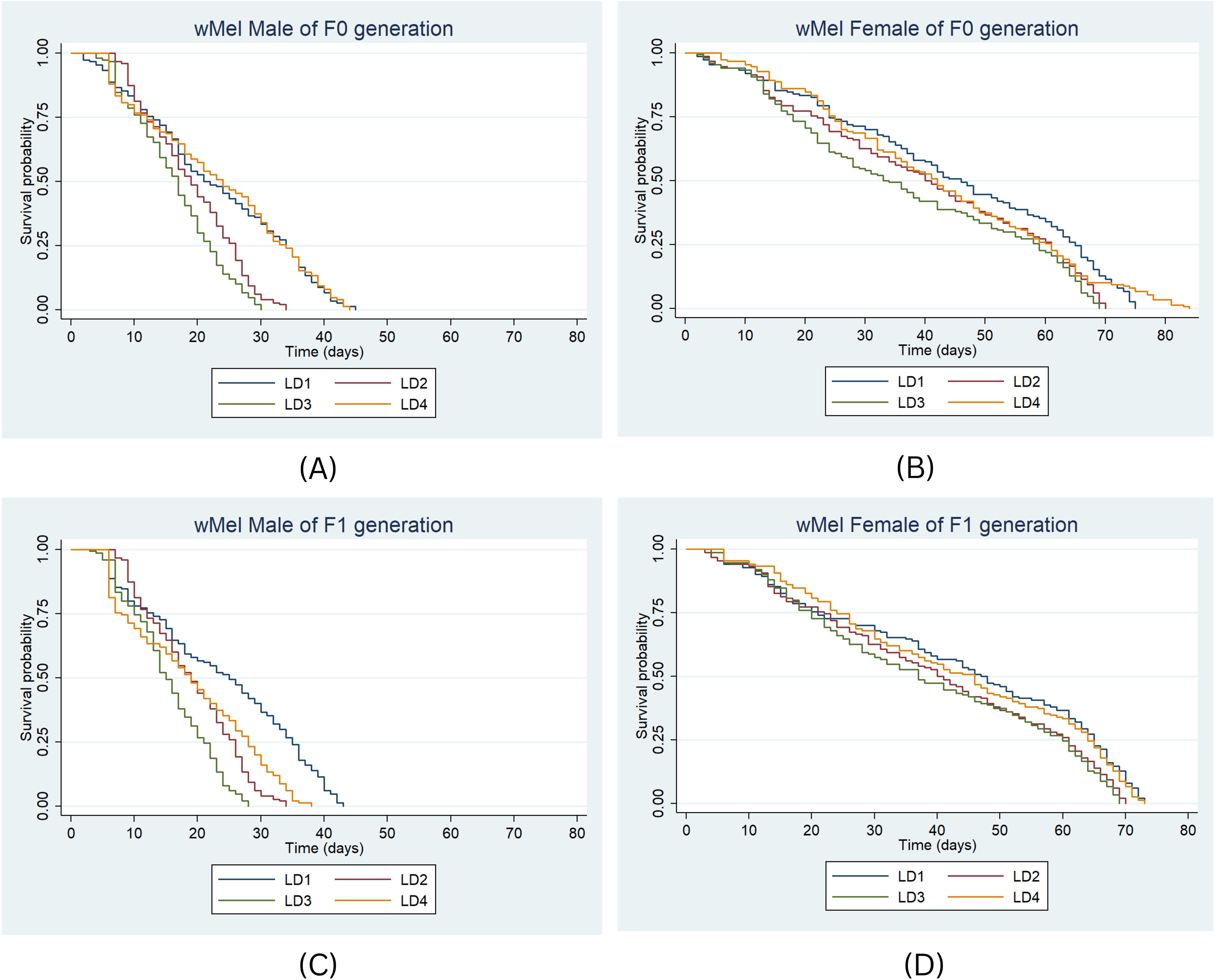 Four survival probability graphs display data for mosquito generations. (A) wMel Male F0 shows varied survival with differences in LD1 to LD4. (B) wAlbB Female F0 depicts gradual decrease over time. (C) wMel Male F1 illustrates a sharper decline. (D) wMel Female F1 shows a similar pattern with noticeable variance among the four lines. Each graph tracks survival probability over time in days. Legends indicate different LD tests.