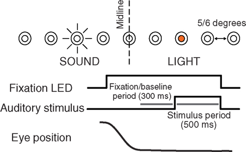 Figure 1. Experimental design. Subjects were required to fixate one of eight to nine LEDs along the horizontal dimension. After fixating for 600–900 ms, a white noise burst was presented for 500 ms from a speaker at an independent location while the subject maintained fixation. In some experiments, fixation continued while a series of three additional sounds were presented (500 ms duration, 500 ms intersound interval). The last 300 ms of the fixation interval before each sound was used to assess baseline activity.