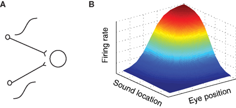 Figure 3. Gain field coding of eye position and sound source location. (A) Gain field network, in which a target neuron directly receives eye position and auditory inputs, illustrated here as sigmoidal in shape. The response of a simulated target neuron for multiplicative interactions is shown in (B). The response is characterized by a systematic combination of both inputs. In principle, input signals need not be sigmoidal and the interaction could be either additive, multiplicative, or a combination of the two.