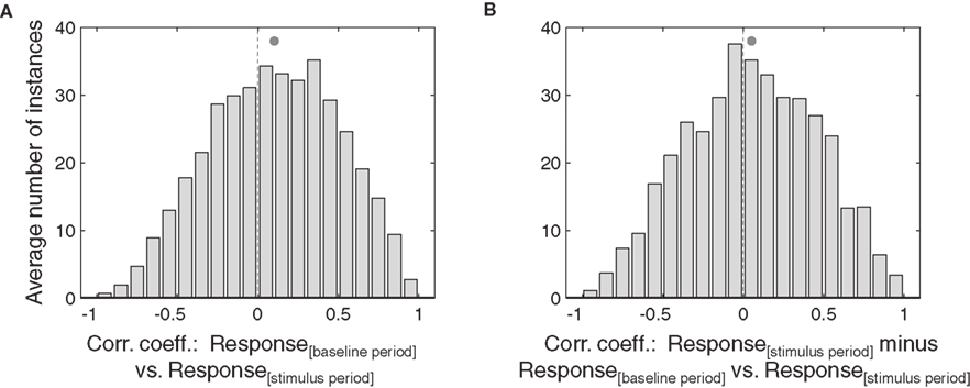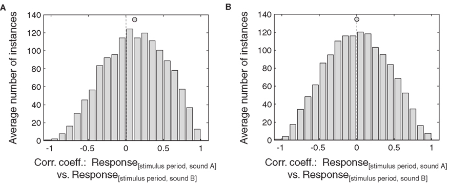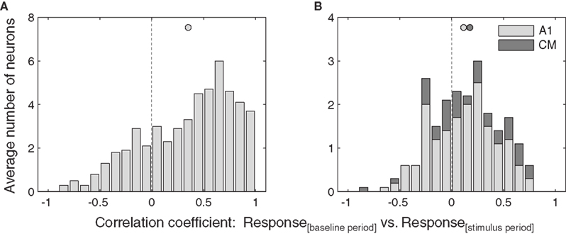 Figure 5. Similarity of eye position effects during baseline and stimulus. Distribution of correlations between responses as a function of eye position during the baseline period and the stimulus period, for all neurons that showed a significant of eye position during either the stimulus or baseline periods. Data from inferior colliculus (A) and auditory cortex (B) are pooled across sound location. Filled circles indicate the mean.