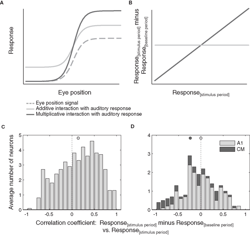 Figure 6. Additive versus multiplicative effects of eye position. (A) Shows hypothetical additive and multiplicative effects of a monotonic eye position signal on an auditory response. The resulting correlation between the response difference (stimulus minus baseline) and the stimulus period response as a function of eye position is shown in (B). (C,D) Distribution of correlations of stimulus responses minus baseline activity versus absolute stimulus responses as a function of eye position, for all neurons that showed significant effect of eye position. Data from inferior colliculus (C) and auditory cortex (D) are pooled across sound location. Filled circles indicate the mean.