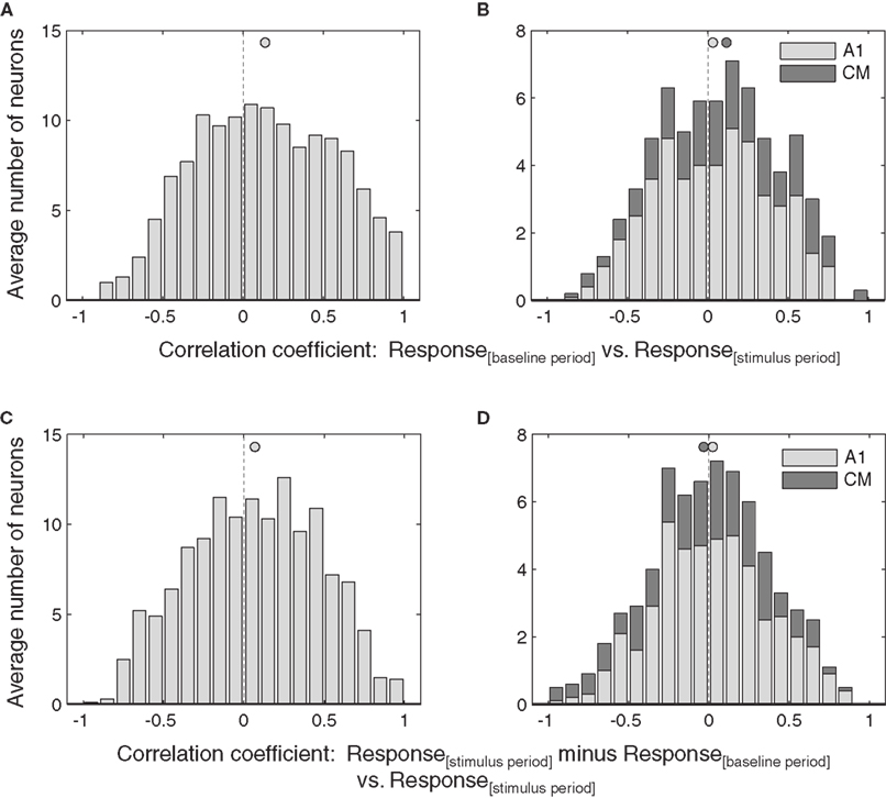 In contrast, the correlation between stimulus and baseline periods in AC were much weaker (Figure 5B), and did not reach significance for A1 or CM individually, although when the auditory cortical data were combined they did reach significance (p < 0.05). A similar pattern held at the level of individual neurons. In the IC, about half (23 of 51, or 45%) showed a significant positive correlation coefficient. In A1, this proportion was considerably smaller (2 of 17, or 12%), and none of the CM neurons were individually significant (0 or 5, or 0%), for an overall AC proportion of 9%.