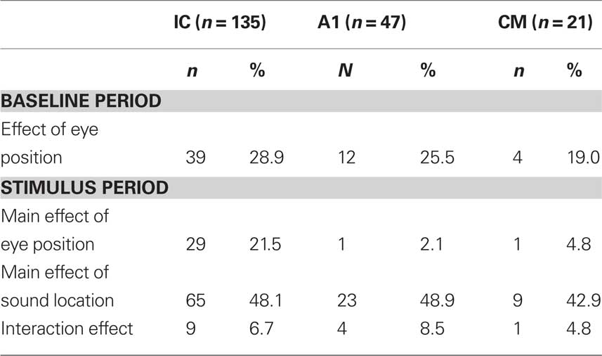 The incidence of eye position sensitivity during the stimulus period in A1 neurons was lower than in our previous reports involving this data set. This appears to be connected to our use of a shorter time window, tightly focused on the brief excitatory auditory burst, and the exclusion of the later inhibitory response period that is evident in many A1 neurons. Eye position signals were evident in the baseline period, however, in all three brain structures.