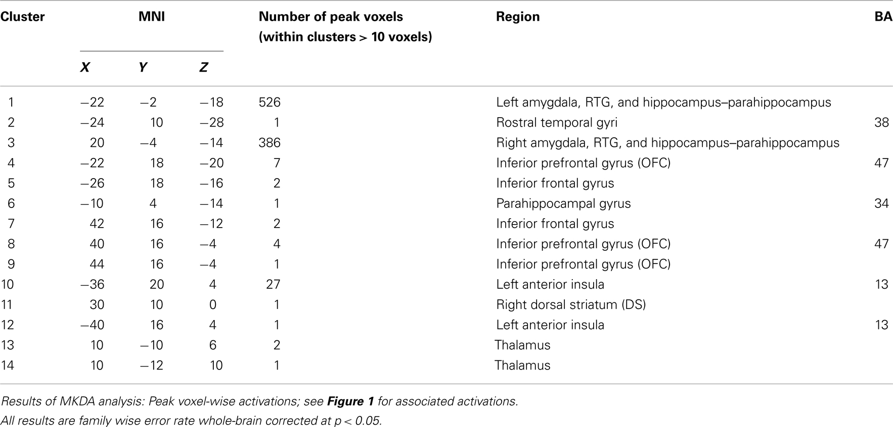 The benefits of using the multilevel kernel density analysis (MKDA) meta-analytic approach over others, as well as an extensive elaboration of technical considerations, has been covered in-depth elsewhere (Salimi-Khorshidi et al., 2009; Wager et al., 2009). Briefly, MKDA is a coordinate-based meta-analytic method which determines the activation probability of each voxel (to create voxel-based study comparison maps) and contiguous voxel clusters (to create extent-based study comparison maps which identify significant clusters of activation) across the brain. Compared with other meta-analysis methods, MKDA prevents any single study reporting a large number of activations from biasing the results (i.e., the study is the unit of analysis) and weights contrasts based on the quality of the study (e.g., random vs. fixed effects) and the sample size. Peaks from each study were convolved with a spherical kernel of 10 mm radius; the threshold for statistical significance was determined using a Monte Carlo simulation with 3000 iterations (using 5000 iterations did not alter the results). The voxel size for the present study was 2 mm × 2 mm × 2 mm (i.e., 1 voxel = 8 mm3) and cluster sizes were all greater than 10 voxels (>80 mm3). We have reported peak voxel-wise activations as well as peak cluster-wise activations (which include contiguous voxels significant at p < 0.001; whole-brain FWE corrected). All results are family wise error rate whole-brain corrected at p < 0.05. Analyses were performed in Matlab 2009a (Mathworks, Natick, MA, USA) using MKDA software created by Tor Wager2.