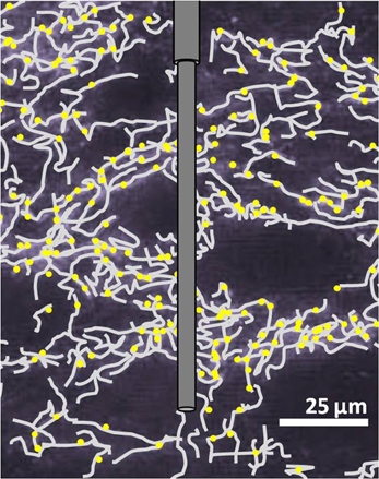 Figure 2. Illustration of a carbon-fiber microelectrode in SNr. Scaling of the microelectrode to in situ serotonergic fibers (gray) and uptake sites (yellow) is a representation based on Moukhles et al. (1997).