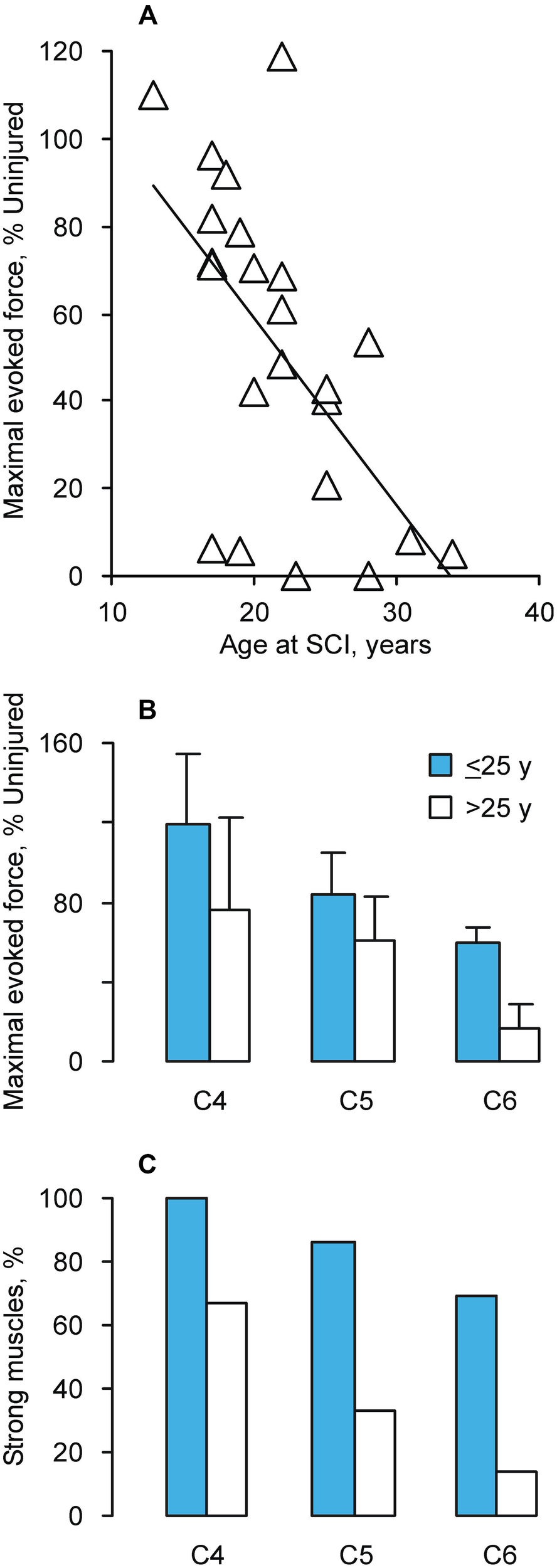 (A) Maximal evoked force vs. age at which C6 SCI occurred (n = 23 muscles; y = −4.28x + 145.07, R2 = 0.36). Mean (+SE) forces for uninjured 20 and 30 year old men were 26.7 ± 1.6 N and 22.9 ± 4.2 N, respectively. The corresponding data for women were 16.4 ± 1.7 N and 18,7 ± 1.8 N. (B) Mean (±SE) maximal evoked thenar force (n = 42 muscles) normalized to age and sex-matched uninjured data (n = 40 muscles). (C) Percentage of strong muscles (>50% uninjured force), separated by SCI level and age at SCI (Younger: ≤25 years; Young: >25 years; n = 42 muscles).
