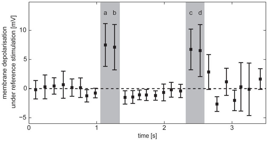 TABLE 1. Results of two-sided t-tests for ΔV ≠ 0, asterisk marks significance (p <0.05), number N of recorded cells included in calculations and average object induced absolute difference in membrane depolarization without normalization (abs. ΔV) for all combinations of background (bg.) and object (obj.).