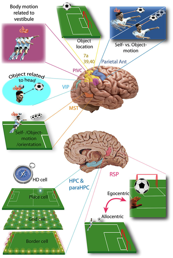 Figure 1. Vestibular cortices and spatial cognition. Vestibular cortices involved in spatial cognition, illustrated in a soccer player: HD cell, head direction cell; HPC, hippocampus; MST, medial superior temporal area; ParaHPC, parahippocampal cortex; Parietal Ant, parietal anterior cortex; PIVC, parieto-insular vestibular cortex; RSP, retrosplenial cortex; VIP, ventral intraparietal area; 7a, 39, 40 Brodmann area. (References in the text).