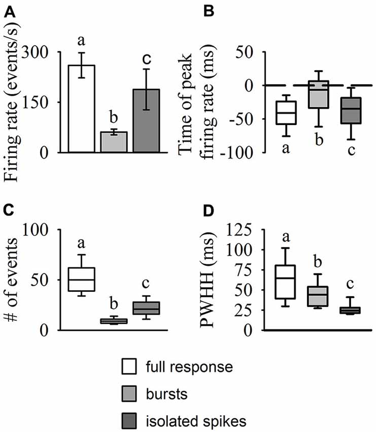 Figure 4. Statistical comparisons of DCMD response types (full responses, bursts, and isolated spikes). The amplitude and time of peak firing rate (A,B), total number of events (spikes or bursts), (C) and peak width at half height (PWHH); (D) were all significantly different between each of the response types. The values reported for the full DCMD response are consistent with previously published work (see “Results” Section). The isolated spike rate generally increased up to 200 ms before TOC, generating a relatively short but high peak firing rate, while bursting generally increased and peaked from 200 ms before TOC to TOC. Different letters above or below bars or boxes represent significant differences between parameters within each panel. Significance assessed at P < 0.05.