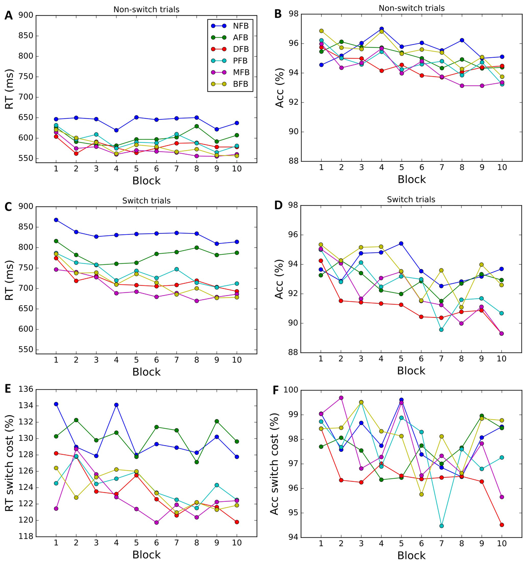 Figure 4. Behavioral data by condition. Average RTs and accuracy for non-switch (A,B) and switch trials (C,D) in each block and corresponding switch costs (E,F). Each color corresponds to a different condition (NFB, No feedback; AFB, Accuracy feedback; correct or incorrect feedback, DFB, Difficulty aware feedback; bonus if fast and correct, PFB, Punishment feedback; punishment, −1 coin for incorrect responses, MFB, Monetary feedback; same as PFB, but each coin is worth 0.2 cents, BFB, Block feedback; same as PFB, but at the end of each block they are given block accuracy performance).