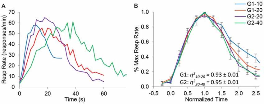Figure 2. Response functions in the dual peak-interval (PI) procedure under saline condition. (A) Average response rates (resp/min) in the saline condition by group and criterion. (B) Average response rates (±SEM) normalized in amplitude and time. The degree of superposition between normalized functions is indicated by the superposition index η2, which shows a very high compliance with scalar timing.