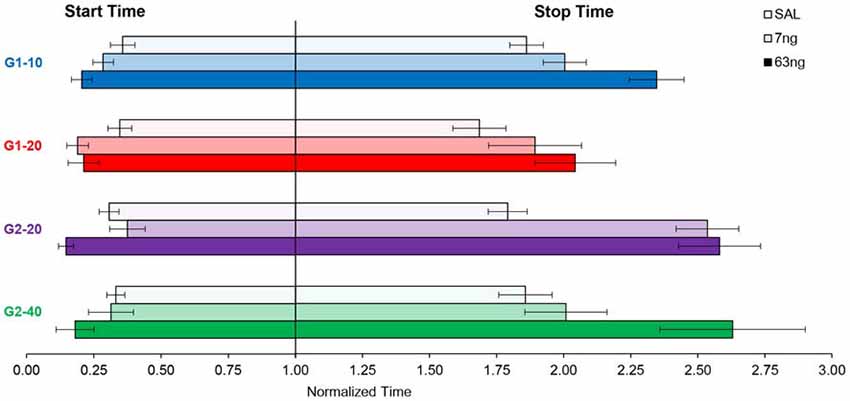 Figure 2A shows the average response rates in the dual PI (non-reinforced) trials during the baseline (control) saline condition. Rats clearly produced distinct peaks for each of the trial types, showing that their timing was accurate. Analyses of peak time indicated a significant effect for group (F(1,10) = 49) and trial type (F(1,10) = 72.1), and a significant group × trial interaction (F(1,10) = 7.4). Response functions were normalized in amplitude and in time, as shown in Figure 2B. To quantify scalar property, we estimated the degree of superposition of the normalized response curves for each rat between the short and long trials using the η2 superposition index as in Brown et al. (2007) and Buhusi et al. (2009). No significant differences in η2 were found between groups (F(1,10) = 0.39). Estimated η2 was 0.93 ± 0.01 in group G1, and 0.95 ± 0.01 in group G2, indicating a very high degree of superposition (scalar timing). Results indicate very good superposition of response function in both groups and on both durations, thus indicating that rats acquired the timing task and their timing was accurate and scalar in the baseline (saline) condition.