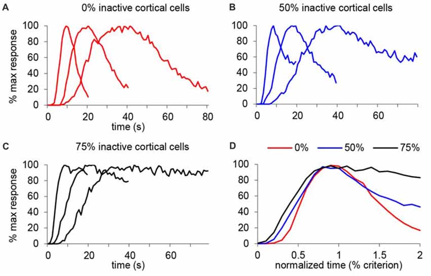 Figure 8. Gradual inactivation of cortical inputs in the Striatal Beat Frequency (SBF) model results in preserved timing accuracy, preserved scalar timing, but gradual impairment in timing precision. Simulated percent maximal SBF output in absolute time units (A–C) and normalized time units (D) for three criterion durations: 10 s, 20 s and 40 s. (A) SBF output when all cortical neurons are active (0% inactive), similar to the saline condition in our study. (B) SBF output when only 50% cortical neurons are active (50% inactive) similar to the 7 ug muscimol condition in our study. (C) SBF output for only 25% cortical neurons active (75% inactive) similar to the 63 ug muscimol condition in our study. (D) Averaged SBF output over the three criteria in normalized time units successfully replicate experimental data presented in Figures 5C,F.