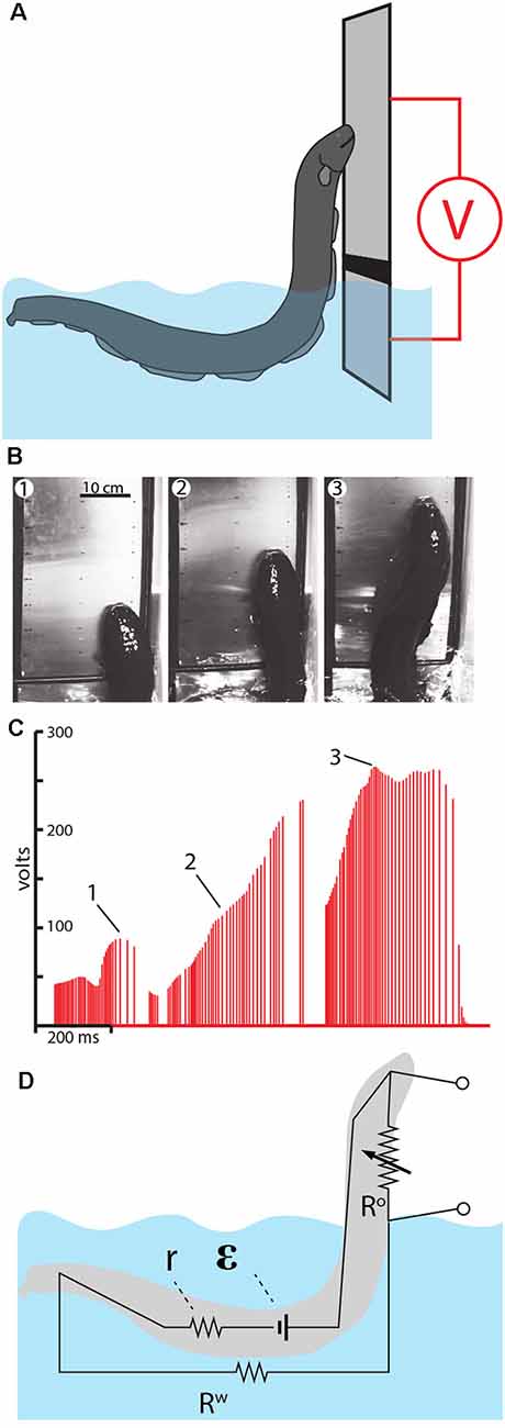 Figure 10. Measurement of voltage during eel leaping defense. (A) Schematic of the plate arrangement and voltmeter used to measure the electrical potential as eels ascended the conductor. Black line indicates a non-conductor separating the plates. (B) Frames from high-speed video for a shocking leap. (C) Voltage measured as the eel ascended. Numbers 1–3 correspond the plates illustrated in (B), indicating the location of the eel at time of discharge. (D) The proposed equivalent circuit that develops as the eel emerges from the water. The electromotive force (EMF) of the electrocytes is represented by ε. The resistors include water resistance, the eel’s internal resistance (r) and the variable resistor (R°) that represents the current path on, or through, the eel back to the main body of water. This path becomes more resistant as the eel ascends to greater heights (from Catania, 2017a, reproduced with permission).