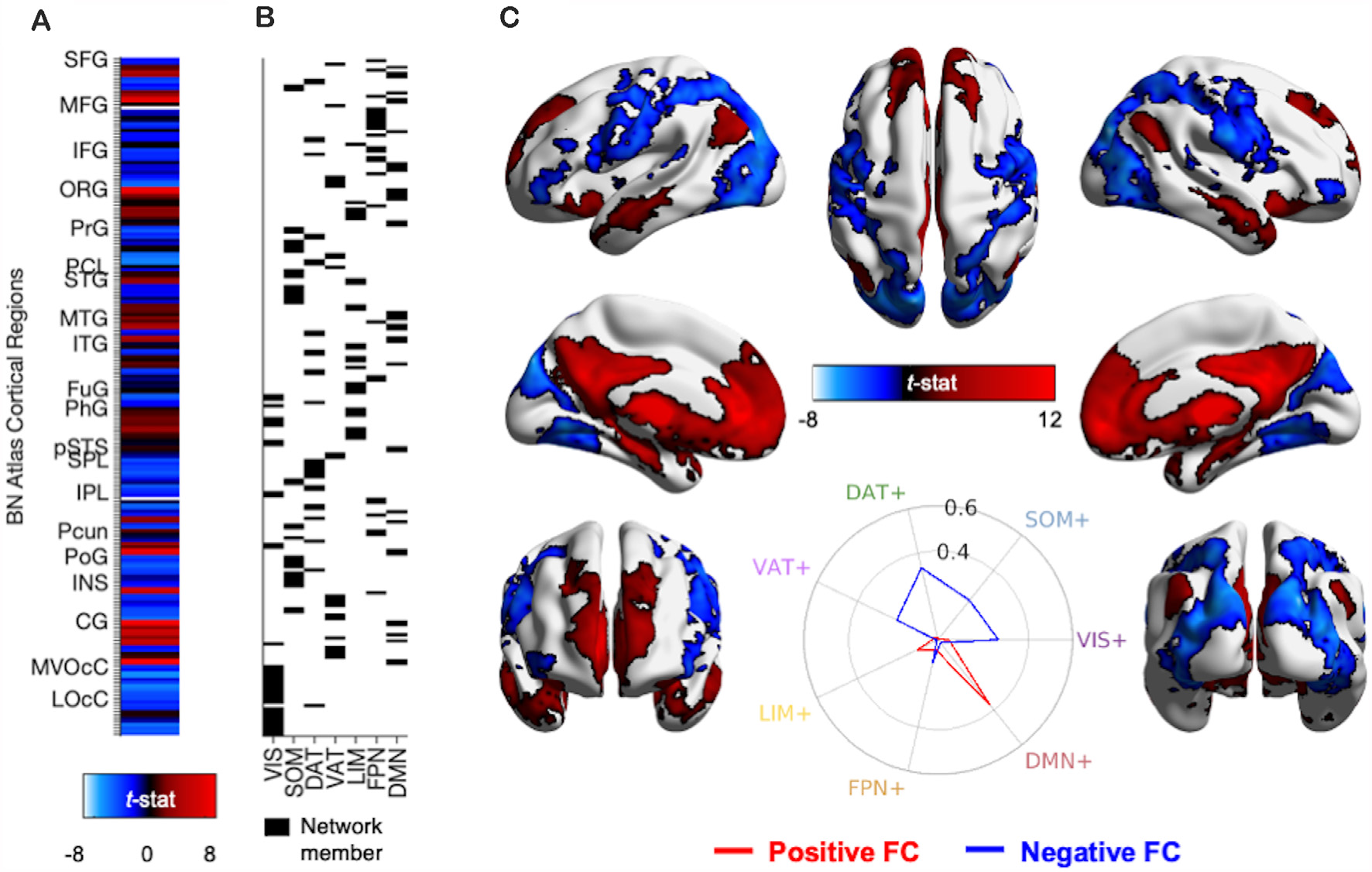 Methods and results for identifying PVT functional connectivity macro-structures. (A) Semi-partial correlation statistics of PVT FC, controlling for the rest of the thalamus, were extracted from the 210 cortical regions of the BN Atlas to create an FC vector. (B) Cosine similarity between the positive FC values (shown in red) and negative FC values (shown in blue) and each of the seven binary vectors representing group membership to a 7-parcellation scheme from Thomas Yeo et al. (2011) were calculated separately. (C) Thresholded network rendered view of the same PVT functional connectivity maps shown in Figure 2. Positive (red) and negative (blue) functional connectivity of the PVT, controlling for average signal from the rest of the thalamus. Results thresholded at pTFCE-FWE < 0.05. Inset polar plot depicts the results of the cosine similarity between the positive functional connectivity (red) and negative functional connectivity (blue) map statistics with binary vectors corresponding to known rest-state networks (Thomas Yeo et al., 2011). The positive FC correspondence is observable between the red region rows in (A) and the Default Mode Network (DMN) network membership column in (B). Polar plots created using code from Cornblath et al. (2020). Abbreviations: CG, cingulate gyrus; DAT, dorsal attention network; DMN, default mode network; FPN, fronto-parietal network; FuG, fusiform gyrus; IFG, inferior frontal gyrus; INS, insula; IPL, inferior parietal lobule; ITG, inferior temporal gyrus; LIM, limbic network; LOcC, lateral occipital cortex; MFG, middle frontal gyrus; MTG, middle temporal gyrus; MVOcC, medio-ventral occipital cortex; OrG, orbital gyrus; PCL, paracentral lobule; Pcun, precuneus; PhG, parahippocampal gyrus; PoG, post-central gyrus; PrG, pre-central gyrus; pSTS, posterior superior temporal sulcus; SFG, superior frontal gyrus; SOM, somato-motor network; SPL, superior parietal lobule; STG, superior temporal gyrus; VAT, ventral attention network; VIS, visual network.