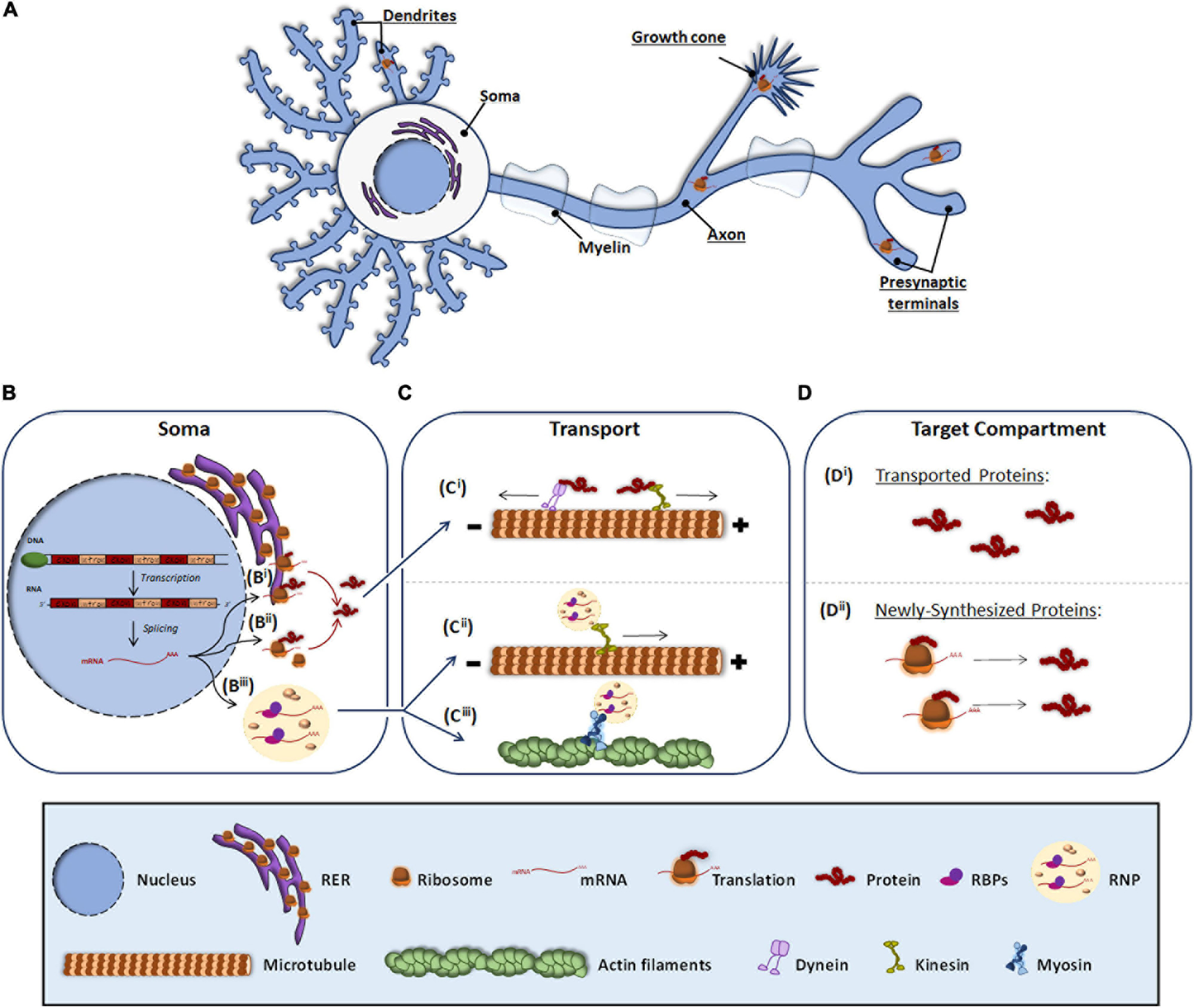 Protein and RNA transport to peripheral subneuronal compartments. Roughly it is underlined the neuronal compartments where local protein synthesis occurs (A). In the soma, expressly in the nucleus, DNA is transcribed to RNA and after splicing, the resulting mRNA (B) can be either processed by the classical somatic translation or the local protein synthesis. For the classical one, the mRNA is translated by ribosomes associated to RER (Bi) and free cytosolic ribosomes (Bii). Synthetized proteins are transported (C) through dyneins or kinesis associated to microtubules (Ci) to target compartments where elicit their function (Di). For local translation, mRNA is associated to RBPs and assembled as RNP granules (Biii), which can be transported through kinesis (Cii) or by myosins linked to actin filaments (Ciii). At the target compartments (D), transported mRNAs are locally translated, and the newly synthesized proteins (Dii) elicit their function.