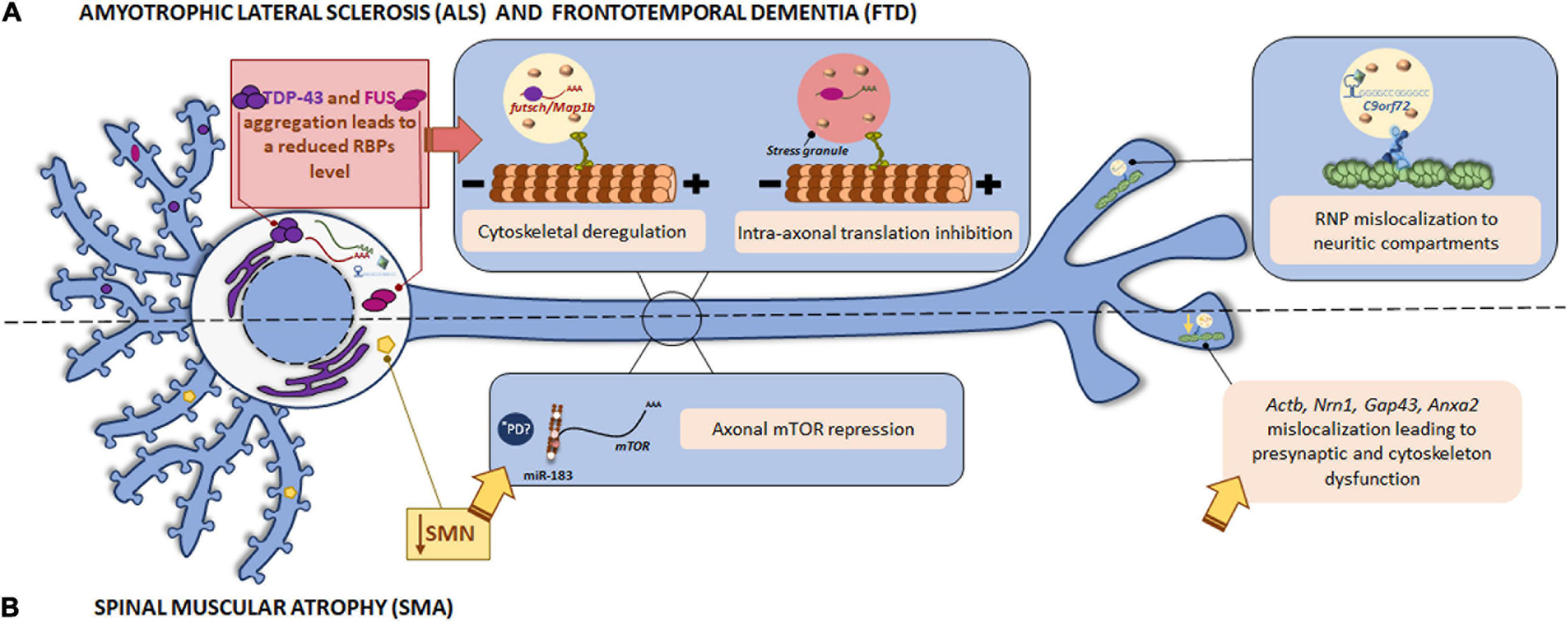 Local translation defects in ALS/FTD and SMN. (A) Among ALS/FTD-linked proteins, TDP-43, FUS, and C9orf72 are found. The RBPs TDP-43 and FUS play a role in RNA metabolism. The aggregates usually found in ALS and FTD patients impair TDP-43 and FUS function leading to altered mRNA localization and the consequent cytoskeletal deregulation and stress-mediated intra-axonal translation inhibition, respectively. The GGGCC repeat expansion in the C9orf72 mRNA triggers its assembly in RNP granules, which are erroneously localized to neuritic compartments and affect to nerve branching. (B) Loss of SMN is the main cause of SMA. SMN is involved in the localization of mRNAs to the axonal compartment. SMN defects lead to Actb, Nrn1, Gap43, and Anxa2 mislocalization with important impact in neurite growth, presynaptic function, and cytoskeleton plasticity. SMN also controls the regulator of local translation mTOR through miR-183. *PD miRNAs are also involved in the translation repression induced by mutant LRRK2 in PD. Due to local miRNAs have been identified as contributors to other pathologies, a similar local mechanism could participate in the pathogenesis of PD.