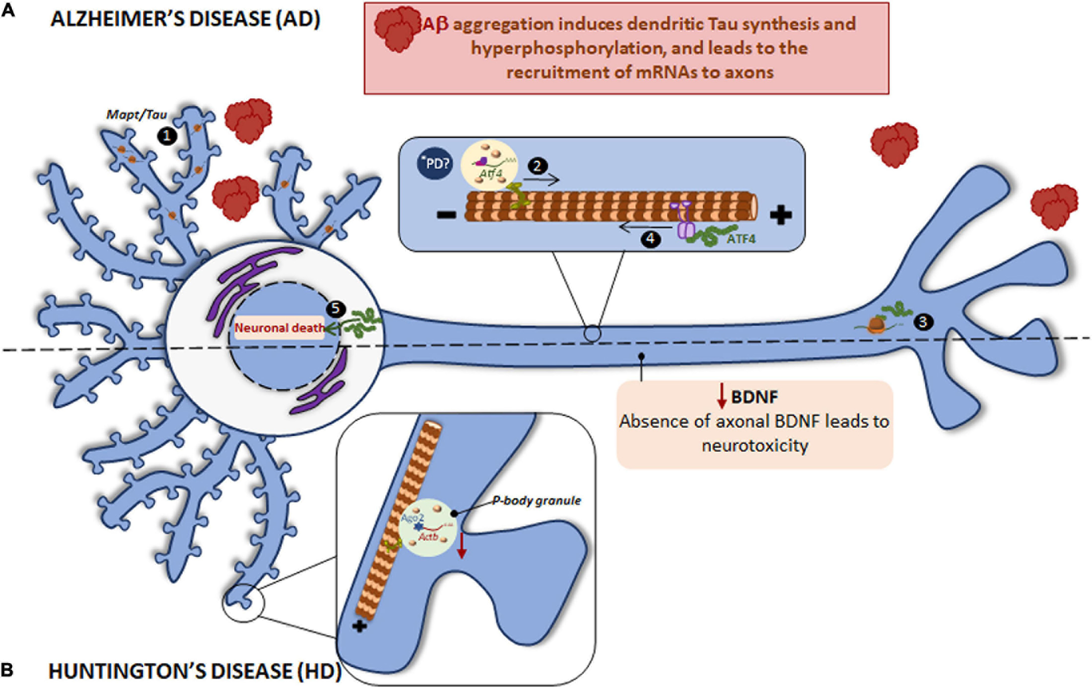 Local translation defects in AD and HD. (A) The two main hallmarks in AD brains are the accumulation of intracellular hyperphosphorylated Tau and extracellular Aβ plaques. Aβ induces the incorrect localization of Mapt mRNA to dendrites with the consequent, local synthesis of Tau and its hyperphosphorylation (1). Aβ also induces the recruitment of certain mRNAs to axons, among them Atf4 is found (2). Once ATF4 is axonally synthesized (3), it is retrogradely transported to cell body (4) where enhances death transcriptional programs (5). *PD ATF4 is also a component of UPR. The UPR is altered in PD and therefore the local ATF4 could be involved in PD progression. (B) HD is caused by a mutant CAG expansion in HTT gene. HTT KO leads to reduced levels of Actb mRNA, Ago2 protein, and p-bodies in dendrites. Mutant HTT impairs BDNF transport to axons resulting in neurotoxicity and probably affects to local protein synthesis since BDNF regulate this process in subneuronal compartments.