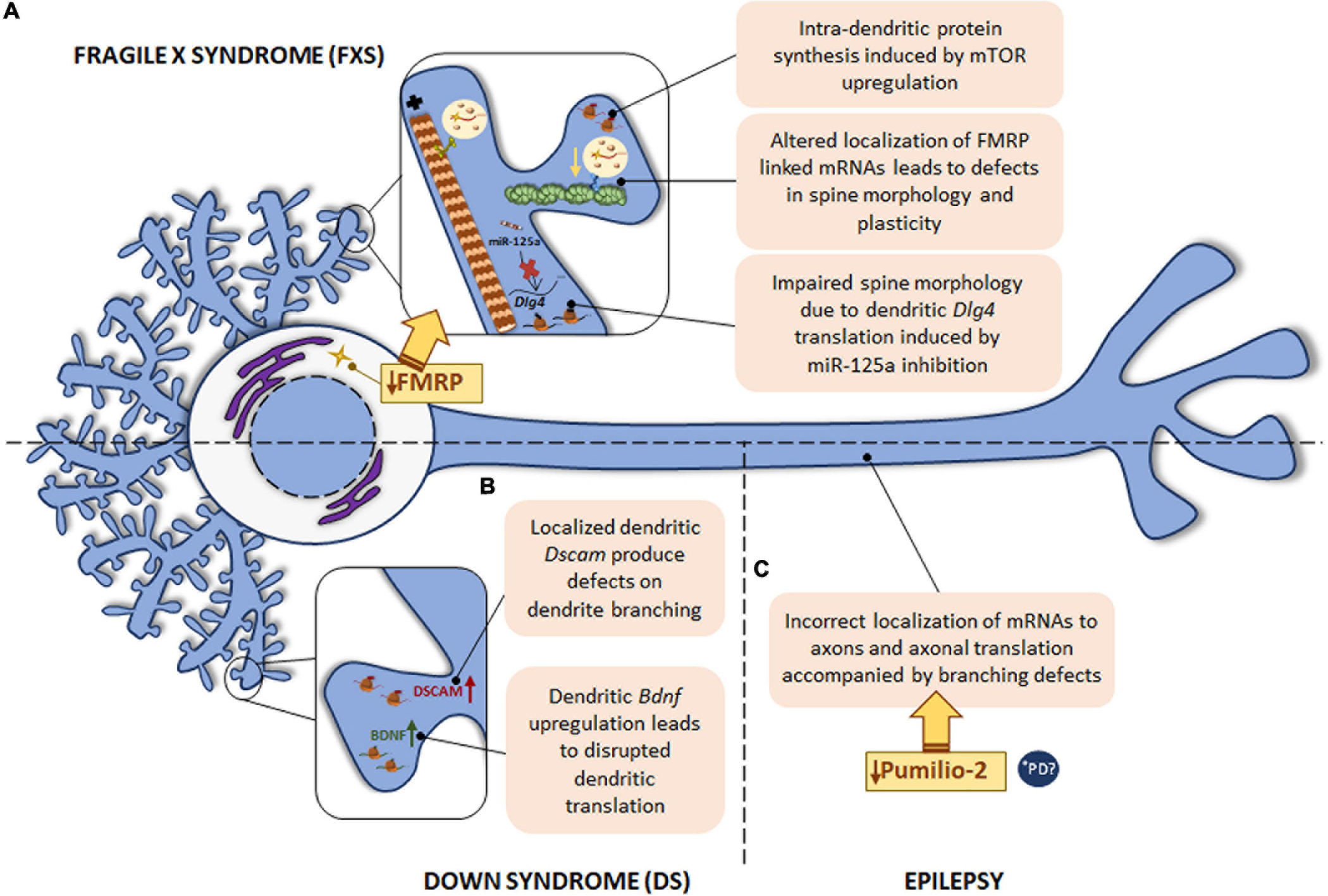 Local translation defects in FXS, DS and epilepsy. (A) The most common monogenic cause of ASD is FXS, caused by a mutation in FMR1 gene with the consequent FMRP protein deficiency. FMRP regulates RNA metabolism at different levels and therefore, intra-dendritic translation is altered at several points: mTOR-mediated local protein synthesis is upregulated; deregulation of local mRNAs-linked to FMRP leads to abnormal spine morphology and plasticity; deregulation of miR-125a induces Dlg4 mRNA dendritic translation with spine morphology defects. (B) DS, caused by trisomy of chromosome 21, is characterized by defects in dendrite morphology, which can be due to the increased levels of Dscam and Bdnf mRNAs in dendrites. The localization of Bdnf to dendrites is also disrupted in psychiatric disorders. (C) In epilepsy, deficiency in the RBP Pumilio-2 results in incorrect localization of mRNAs to axons and increased overall intra-axonal translation with the consequent branching defects. *PD PINK1 and PARK2, involved in PD pathogenesis, regulate translation of mitochondrial proteins by displacement of Pumilio-2 and other RBPs. Due to the local role of Pumilio-2 in translation in developing axons, localized translation in PD could also be altered.