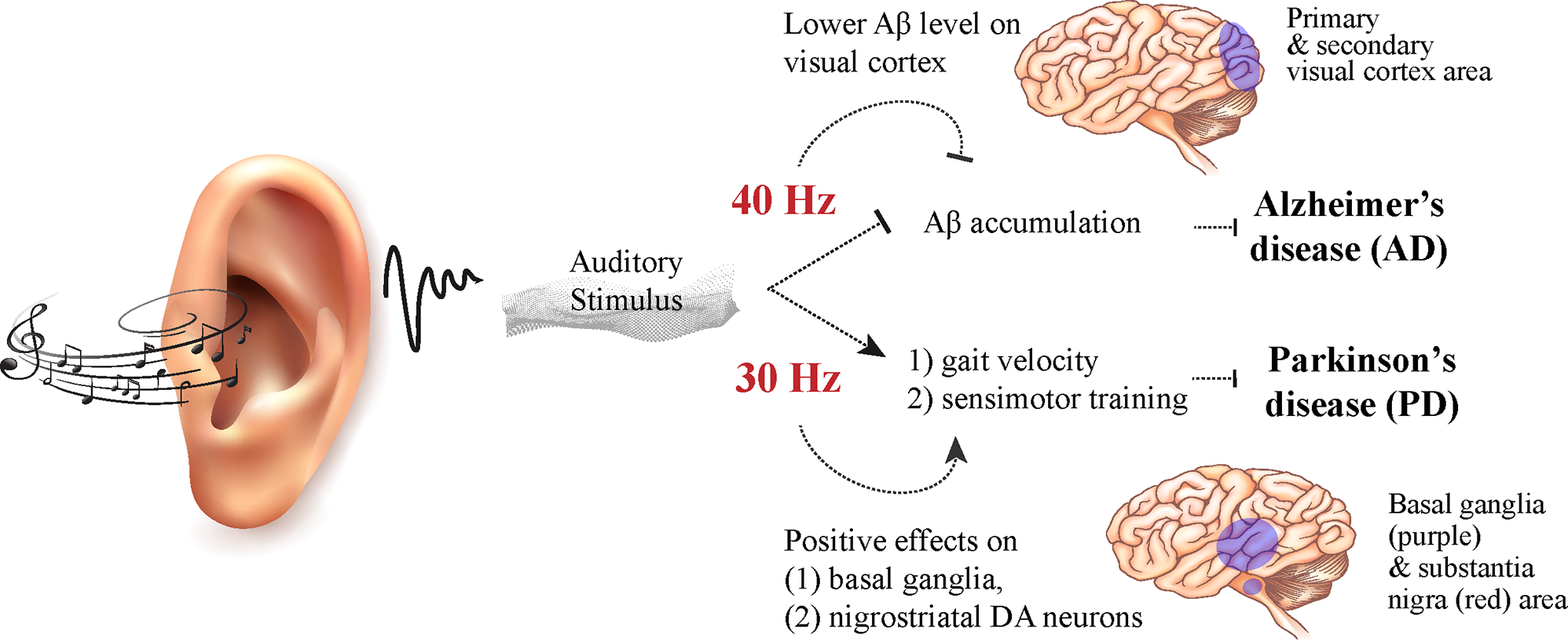 Illustration for the effects of MT-mediated auditory stimulus on neurodegenerative disorders. 40 Hz, as seen as deficient in gamma frequencies in AD patients, has been shown to markedly reduce Aβ accumulation in the visual cortex of mice. 30 Hz has shown improvement in gait velocity in PD patients. Manipulation of these frequencies in the context of MT or sound-based interventions may provide insight into other forms of treatment for AD and PD.