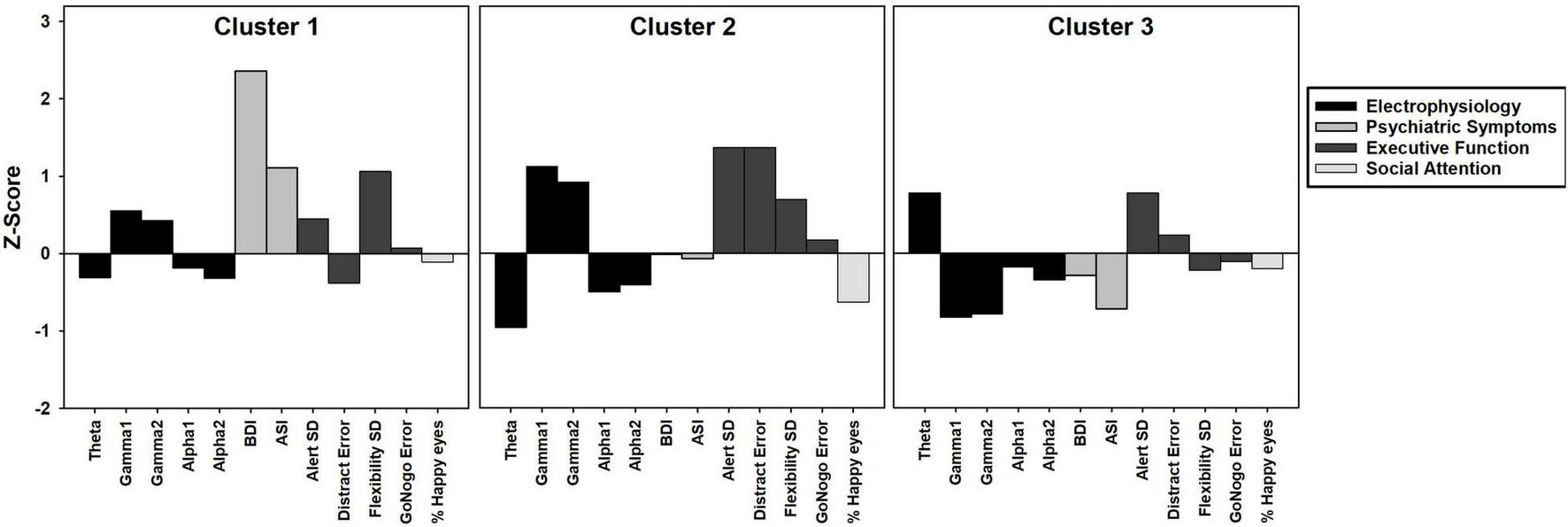 Bar graph depicting k-means cluster analysis results of three clusters of female PMC group. Z-scores based on means and standard deviations from TDC group. Positive z-scores indicate higher values than TDC, negative z-scores indicate lower values than TDC.